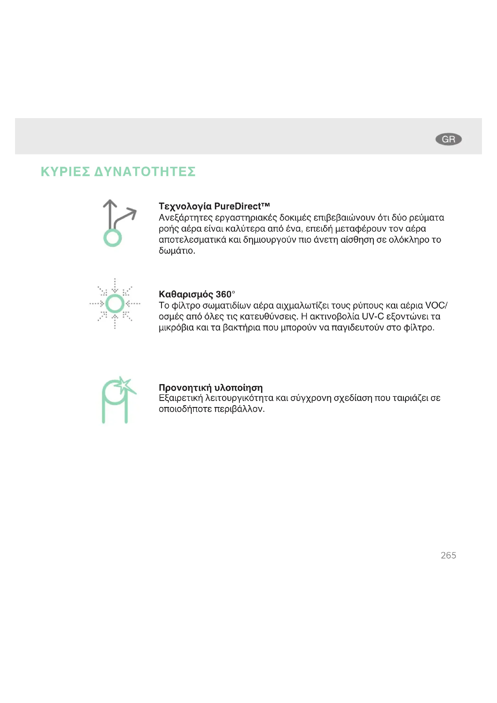 Καθαρισμός 360° Το φίλτρο σωματιδίων αέρα αιχμαλωτίζει τους ρύπους και αέρια VOC/ οσμές από όλες τις κατευθύνσεις. Η ακτινοβολία UV-C εξοντώνει τα μικρόβια και τα βακτήρια που μπορούν να παγιδευτούν στο φίλτρο. Προνοητική υλοποίηση Εξαιρετική λειτουργικότητα και σύγχρονη σχεδίαση που ταιριάζει σε οποιοδήποτε περιβάλλον.266 ΠΙΝΑΚΑΣ ΕΛΕΓΧΟΥ Ρυθμίσεις ταχύτητας ανεμιστήρα Επιλέξτε ταχύτητα ανεμιστήρα: 1, 2 ή Turbo Λειτουργία UV Η λυχνία UV-C στον θάλαμο φίλτρου του καθαριστή αέρα είναι ενεργοποιημένη μόνο όταν