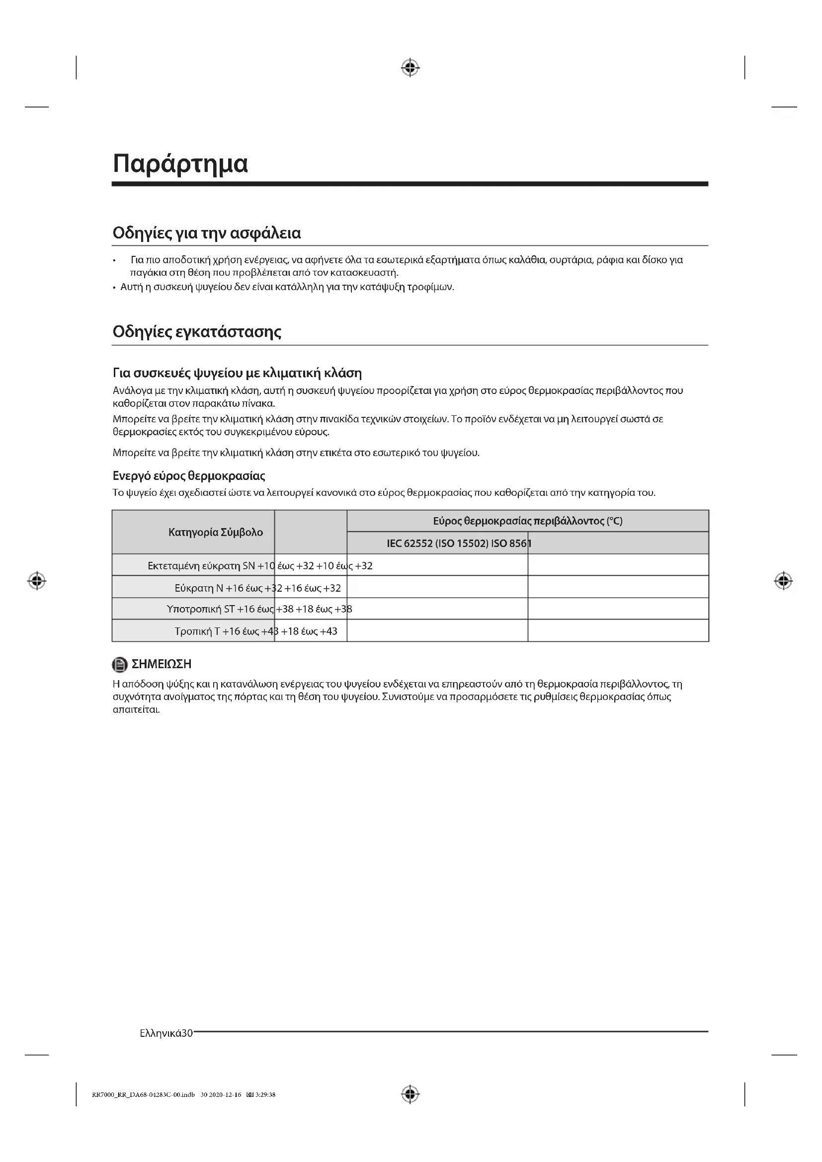 Η απόδοση ψύξης και η κατανάλωση ενέργειας του ψυγείου ενδέχεται να επηρεαστούν από τη θερμοκρασία περιβάλλοντος, τη συχνότητα ανοίγματος της πόρτας και τη θέση του ψυγείου. Συνιστούμε να προσαρμόσετε τις ρυθμίσεις θερμοκρασίας όπως απαιτείται. RR7000_RR_DA68-04283C-00.indb 30 2020-12-16 3:29:38Ελληνικά 31 Οδηγίες για τη θερμοκρασία Συνιστώμενη θερμοκρασία Βέλτιστη ρύθμιση θερμοκρασίας για τη φύλαξη τροφίμων: