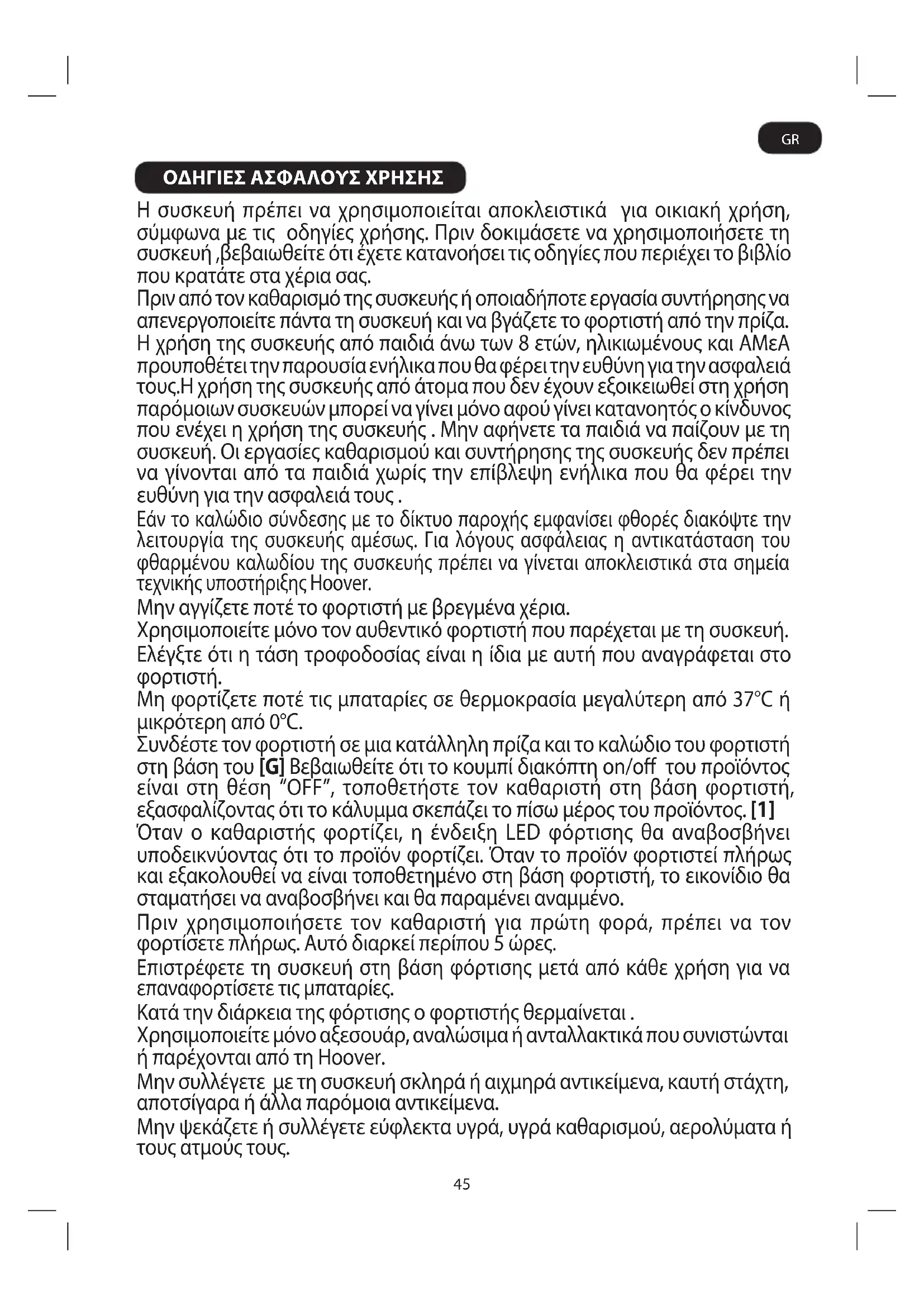 Μη φορτίζετε ποτέ τις μπαταρίες σε θερμοκρασία μεγαλύτερη από 37°C ή μικρότερη από 0°C. Συνδέστε τον φορτιστή σε μια κατάλληλη πρίζα και το καλώδιο του φορτιστή στη βάση του [G] Βεβαιωθείτε ότι το κουμπί διακόπτη on/o του προϊόντος είναι στη θέση “OFF”, τοποθετήστε τον καθαριστή στη βάση φορτιστή, εξασφαλίζοντας ότι το κάλυμμα σκεπάζει το πίσω μέρος του προϊόντος. [1] Όταν ο καθαριστής φορτίζει, η ένδειξη LED φόρτισης θα αναβοσβήνει υποδεικνύοντας ότι το προϊόν φορτίζει. Όταν το προϊόν φορτιστεί πλήρως και εξακολουθεί να είναι τοποθετημένο στη βάση φορτιστή, το εικονίδιο θα σταματήσει να αναβοσβήνει και θα παραμένει αναμμένο. Πριν χρησιμοποιήσετε τον καθαριστή για πρώτη φορά, πρέπει να τον φορτίσετε πλήρως. Αυτό διαρκεί περίπου 5 ώρες. Επιστρέφετε τη συσκευή στη βάση φόρτισης μετά από κάθε χρήση για να επαναφορτίσετε τις μπαταρίες. Κατά την διάρκεια της φόρτισης ο φορτιστής θερμαίνεται . Χρησιμοποιείτε μόνο αξεσουάρ, αναλώσιμα ή ανταλλακτικά που συνιστώνται ή παρέχονται από τη Hoover. Μην συλλέγετε με τη συσκευή σκληρά ή αιχμηρά αντικείμενα, καυτή στάχτη, αποτσίγαρα ή άλλα παρόμοια αντικείμενα. Μην ψεκάζετε ή συλλέγετε εύφλεκτα υγρά, υγρά καθαρισμού, αερολύματα ή τους ατμούς τους. GR46