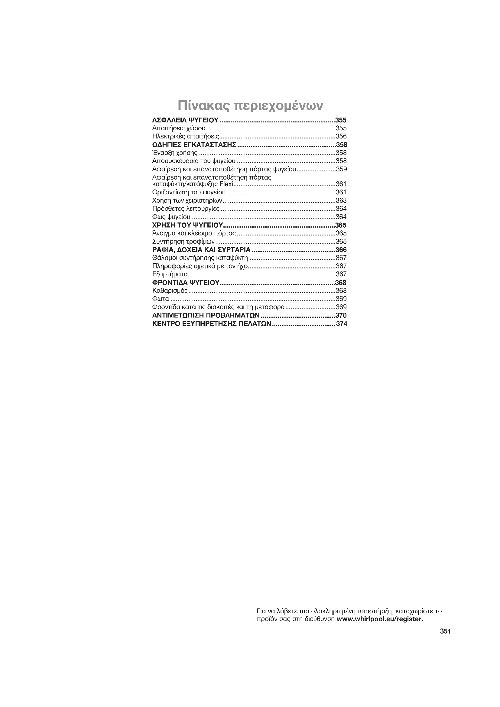 - ΚΕΝΤΡΟ ΕΞΥΠΗΡΕΤΗΣΗΣ ΠΕΛΑΤΩΝ Για να λάβετε πιο ολοκληρωμένη υποστήριξη, καταχωρίστε το προϊόν σας στη διεύθυνση www.whirlpool.eu/register.352 ΟΔΗΓΙΕΣ ΑΣΦΑΛΕΙΑΣ Πριν από τη χρήση της συσκευής, διαβάστε αυτές τις οδηγίες ασφαλείας. Φυλάξτε τις σε κοντινό σημείο για μελλοντική αναφορά. Οι οδηγίες αυτές και η ίδια η συσκευή περιλαμβάνουν σημαντικές προειδοποιήσεις σχετικά με την ασφάλεια, τις οποίες πρέπει να τηρείτε σε κάθε περίπτωση. Οκατασκευαστής δεν αναλαμβάνει καμία ευθύνη για βλάβες λόγω μη τήρησης αυτών των οδηγιών ασφαλείας, για ακατάλληλη χρήση της συσκευής ή για εσφαλμένη ρύθμιση των χειριστηρίων. Τα πολύ μικρά παιδιά (0-3 ετών) δεν πρέπει να πλησιάζουν τη συσκευή. Τα μικρά παιδιά (3-8ετών) δεν πρέπει να πλησιάζουν τη συσκευή, εκτός εάν επιτηρούνται διαρκώς. Τα παιδιά ηλικίας 8 ετών και άνω και τα άτομα με μειωμένες σωματικές, αισθητήριες ή διανοητικές ικανότητες ή με έλλειψη εμπειρίας και γνώσεων μπορούν να χρησιμοποιούν αυτήν τη συσκευή μόνο εφόσον βρίσκονται υπό επιτήρηση ή έχουν λάβει οδηγίες σχετικά με την ασφαλή χρήση της συσκευής και κατανοούν τους σχετικούς κινδύνους. Ταπαιδιά δεν πρέπει να παίζουν με τη συσκευή. Ο καθαρισμός και η συντήρηση χρήστη δεν πρέπει να πραγματοποιούνται από παιδιά χωρίς p. 374