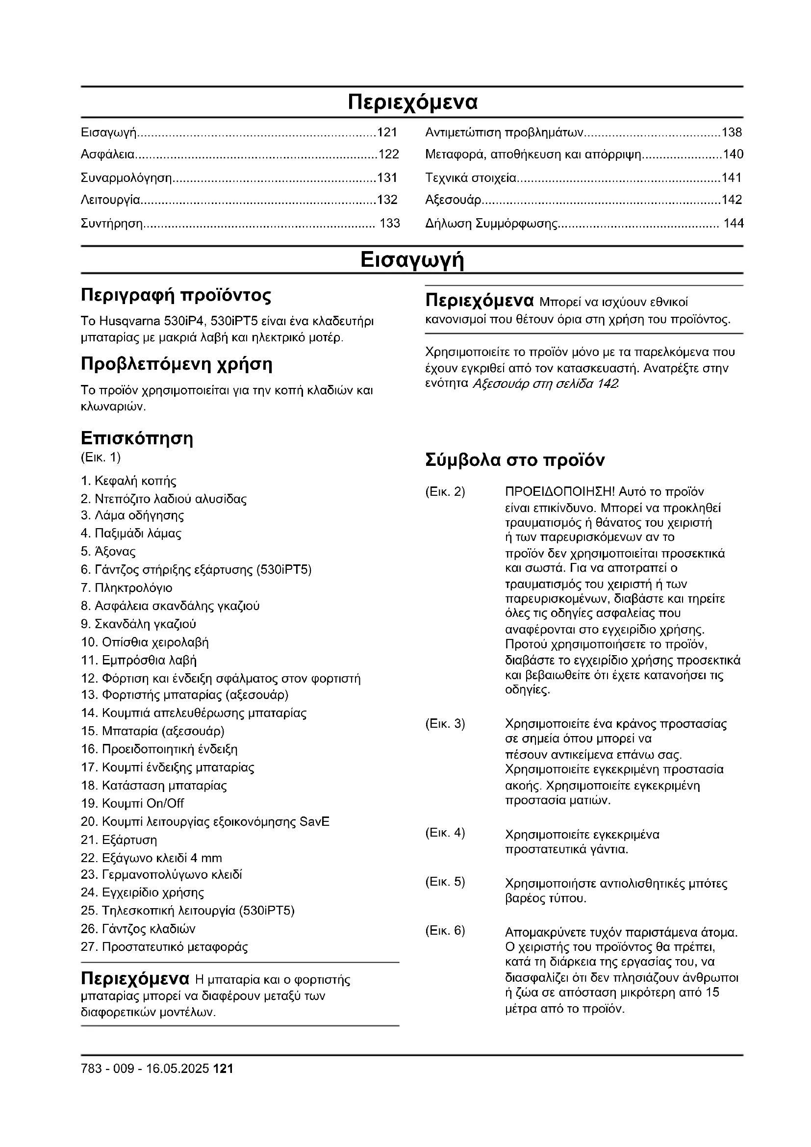 Περιγραφή προϊόντος Το Husqvarna 530iP4, 530iPT5 είναι ένα κλαδευτήρι μπαταρίας με μακριά λαβή και ηλεκτρικό μοτέρ. Προβλεπόμενη χρήση Το προϊόν χρησιμοποιείται για την κοπή κλαδιών και