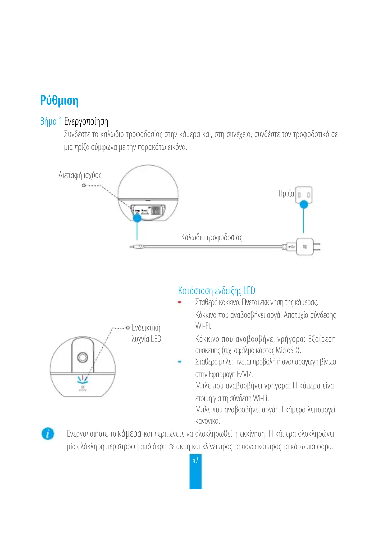 και περιμένετε να ολοκληρωθεί η εκκίνηση. Η κάμερα ολοκληρώνει μία ολόκληρη περιστροφή από άκρη σε άκρη και κλίνει προς τα πάνω και προς τα κάτω μία φορά. Κατάσταση ένδειξης LED50 Βήμα 2 Ρύθμιση κάμερας