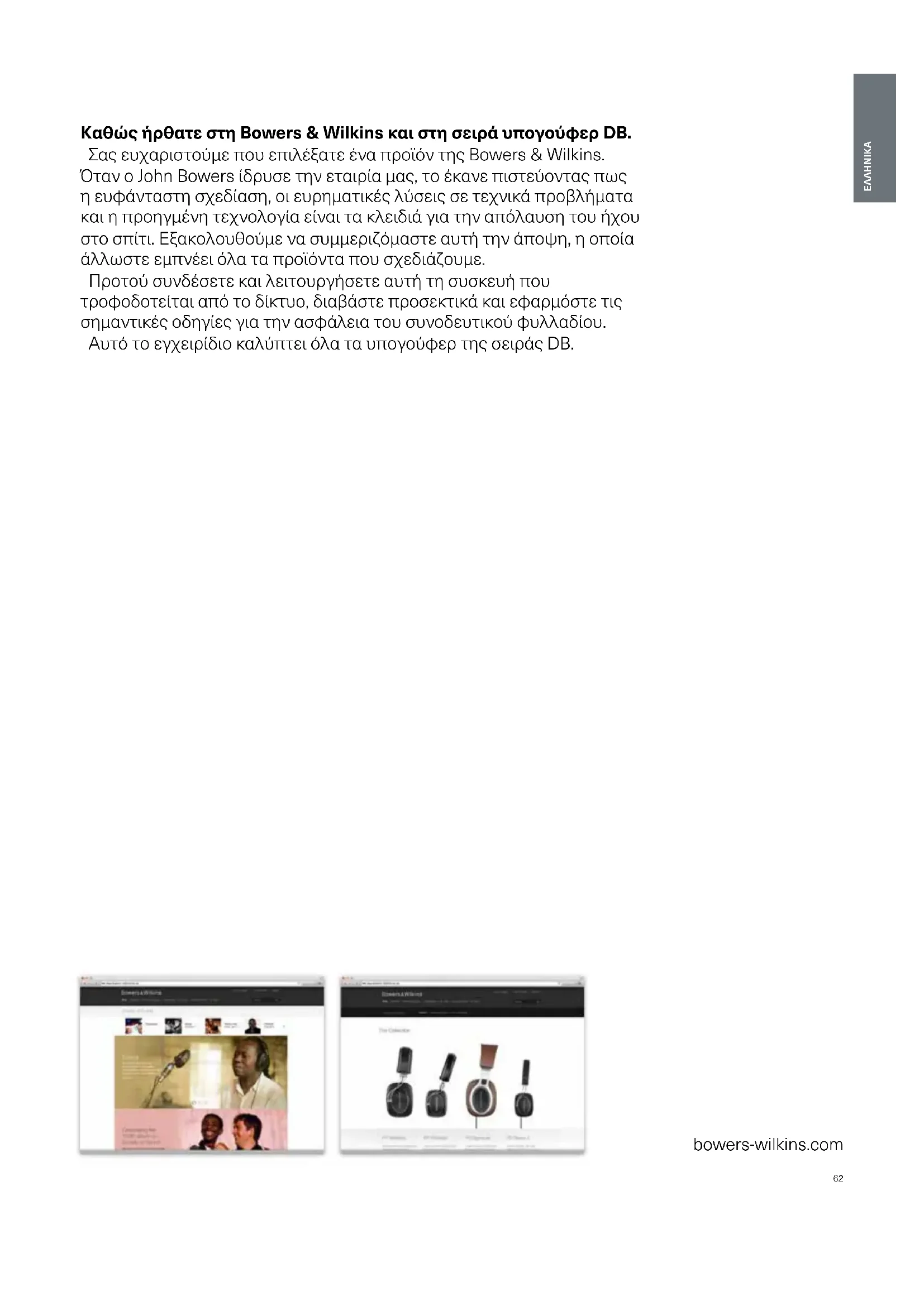 bowers-wilkins.com Καθώς ήρθατε στη Bowers & Wilkins και στη σειρά υπογούφερ DB. Σας ευχαριστούμε που επιλέξατε ένα προϊόν της Bowers & Wilkins. Όταν ο John Bowers ίδρυσε την εταιρία μας, το έκανε πιστεύοντας πως η ευφάνταστη σχεδίαση, οι ευρηματικές λύσεις σε τεχνικά προβλήματα και η προηγμένη τεχνολογία είναι τα κλειδιά για την απόλαυση του ήχου στο σπίτι. Εξακολουθούμε να συμμεριζόμαστε αυτή την άποψη, η οποία άλλωστε εμπνέει όλα τα προϊόντα που σχεδιάζουμε. Προτού συνδέσετε και λειτουργήσετε αυτή τη συσκευή που τροφοδοτείται από το δίκτυο, διαβάστε προσεκτικά και εφαρμόστε τις σημαντικές οδηγίες για την ασφάλεια του συνοδευτικού φυλλαδίου. Αυτό το εγχειρίδιο καλύπτει όλα τα υπογούφερ της σειράς DB.