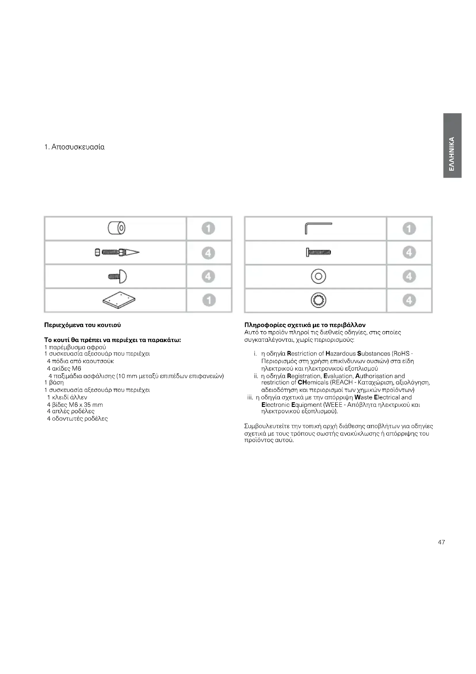 Περιεχόμενα του κουτιού Το κουτί θα πρέπει να περιέχει τα παρακάτω: 1 παρέμβυσμα αφρού 1 συσκευασία αξεσουάρ που περιέχει 4 πόδια από καουτσούκ 4 ακίδες M6 4 παξιμάδια ασφάλισης (10 mm μεταξύ επιπέδων επιφανειών) 1 βάση 1 συσκευασία αξεσουάρ που περιέχει 1 κλειδί άλλεν 4 βίδες M6 x 35 mm 4 απλές ροδέλες 4 οδοντωτές ροδέλες Πληροφορίες σχετικά με το περιβάλλον Αυτό το προϊόν πληροί τις διεθνείς οδηγίες, στις οποίες συγκαταλέγονται, χωρίς περιορισμούς: