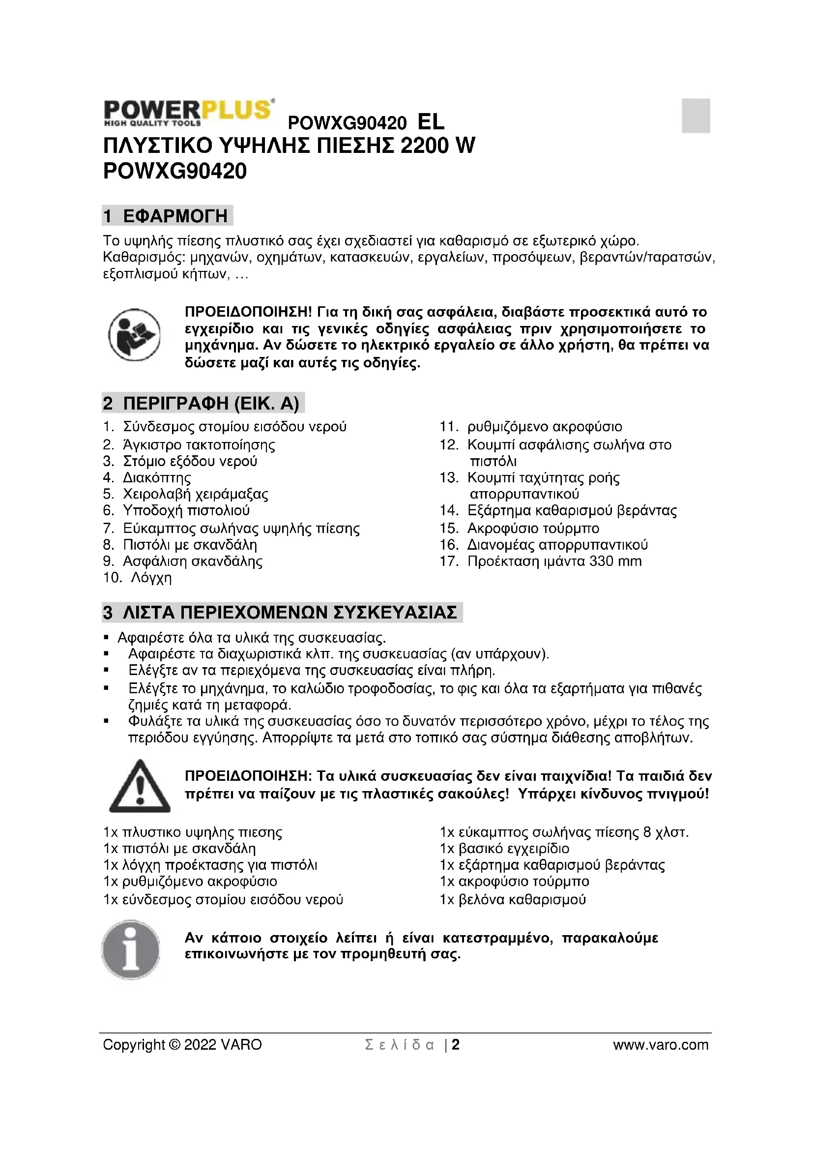 10 ΑΠΟΘΗΚΕΥΣΗ ................................................................................ 8 11 ΑΝΤΙΜΕΤΩΠΙΣΗ ΠΡΟΒΛΗΜΑΤΩΝ ................................................. 9POWXG90420 EL Copyright © 2022 VARO Σ ε λ ί δ α | 2 www.varo.com ΠΛΥΣΤΙΚΟ ΥΨΗΛΗΣ ΠΙΕΣΗΣ 2200 W POWXG90420 1 ΕΦΑΡΜΟΓΗ Το υψηλής πίεσης πλυστικό σας έχει σχεδιαστεί για καθαρισμό σε εξωτερικό χώρο. Καθαρισμός: μηχανών, οχημάτων, κατασκευών, εργαλείων, προσόψεων, βεραντών/ταρατσών, εξοπλισμού κήπων, … ΠΡΟΕΙΔΟΠΟΙΗΣΗ! Για τη δική σας ασφάλεια, διαβάστε προσεκτικά αυτό το εγχειρίδιο και τις γενικές οδηγίες ασφάλειας πριν χρησιμοποιήσετε το μηχάνημα. Αν δώσετε το ηλεκτρικό εργαλείο σε άλλο χρήστη, θα πρέπει να δώσετε μαζί και αυτές τις οδηγίες. 2 ΠΕΡΙΓΡΑΦΗ (ΕΙΚ. A)