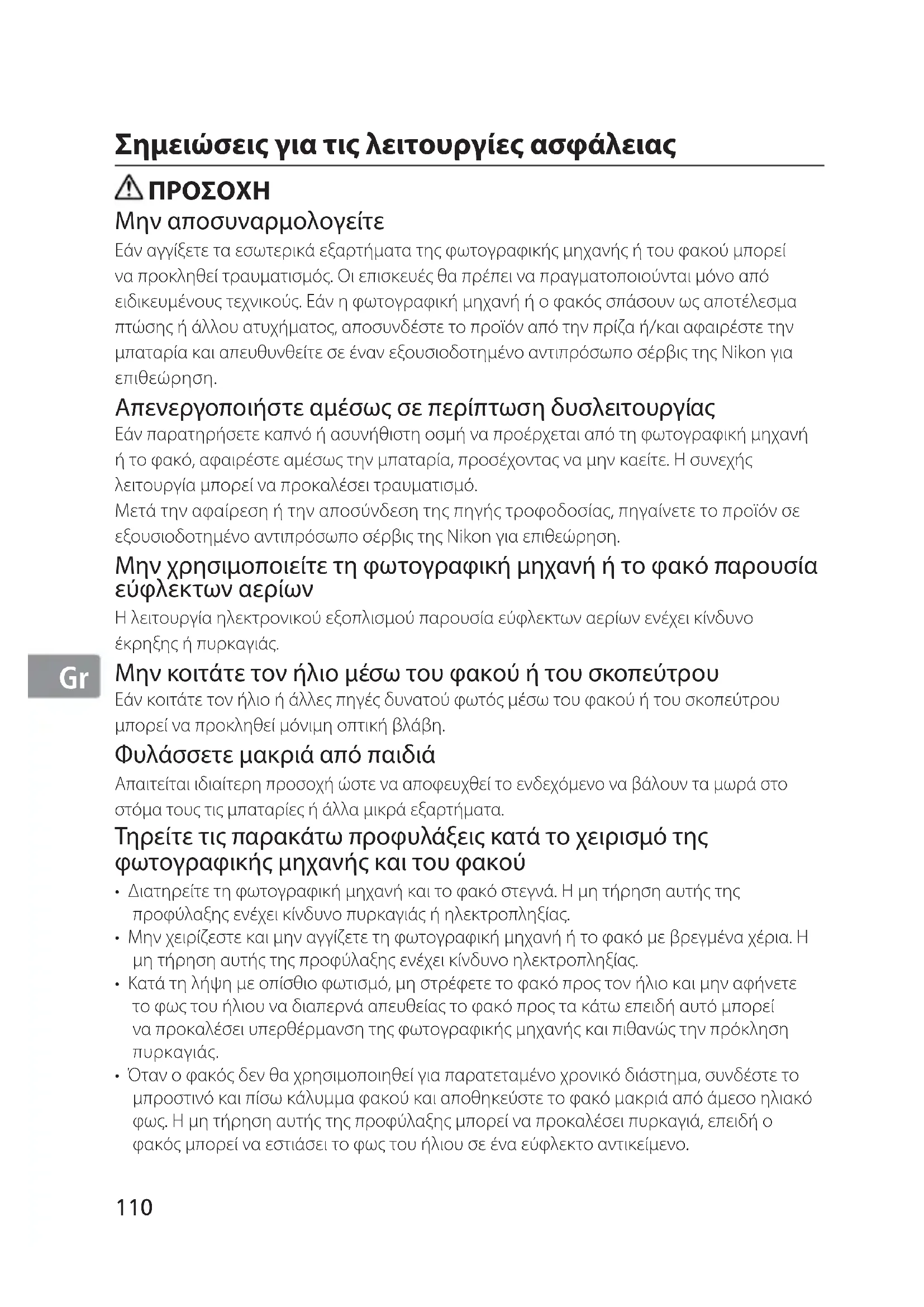Μην αποσυναρμολογείτε Εάν αγγίξετε τα εσωτερικά εξαρτήματα της φωτογραφικής μηχανής ή του φακού μπορεί να προκληθεί τραυματισμός. Οι επισκευές θα πρέπει να πραγματοποιούνται μόνο από ειδικευμένους τεχνικούς. Εάν η φωτογραφική μηχανή ή ο φακός σπάσουν ως αποτέλεσμα πτώσης ή άλλου ατυχήματος, αποσυνδέστε το προϊόν από την πρίζα ή/και αφαιρέστε την μπαταρία και απευθυνθείτε σε έναν εξουσιοδοτημένο αντιπρόσωπο σέρβις της Nikon για επιθεώρηση. Απενεργοποιήστε αμέσως σε περίπτωση δυσλειτουργίας Εάν παρατηρήσετε καπνό ή ασυνήθιστη οσμή να προέρχεται από τη φωτογραφική μηχανή ή το φακό, αφαιρέστε αμέσως την μπαταρία, προσέχοντας να μην καείτε. Η συνεχής λειτουργία μπορεί να προκαλέσει τραυματισμό. Μετά την αφαίρεση ή την αποσύνδεση της πηγής τροφοδοσίας, πηγαίνετε το προϊόν σε εξουσιοδοτημένο αντιπρόσωπο σέρβις της Nikon για επιθεώρηση. Μην χρησιμοποιείτε τη φωτογραφική μηχανή ή το φακό παρουσία εύφλεκτων αερίων Η λειτουργία ηλεκτρονικού εξοπλισμού παρουσία εύφλεκτων αερίων ενέχει κίνδυνο έκρηξης ή πυρκαγιάς. Μην κοιτάτε τον ήλιο μέσω του φακού ή του σκοπεύτρου Εάν κοιτάτε τον ήλιο ή άλλες πηγές δυνατού φωτός μέσω του φακού ή του σκοπεύτρου μπορεί να προκληθεί μόνιμη οπτική βλάβη. Φυλάσσετε μακριά από παιδιά Απαιτείται ιδιαίτερη προσοχή ώστε να αποφευχθεί το ενδεχόμενο να βάλουν τα μωρά στο στόμα τους τις μπαταρίες ή άλλα μικρά εξαρτήματα. Τηρείτε τις παρακάτω προφυλάξεις κατά το χειρισμό της φωτογραφικής μηχανής και του φακού