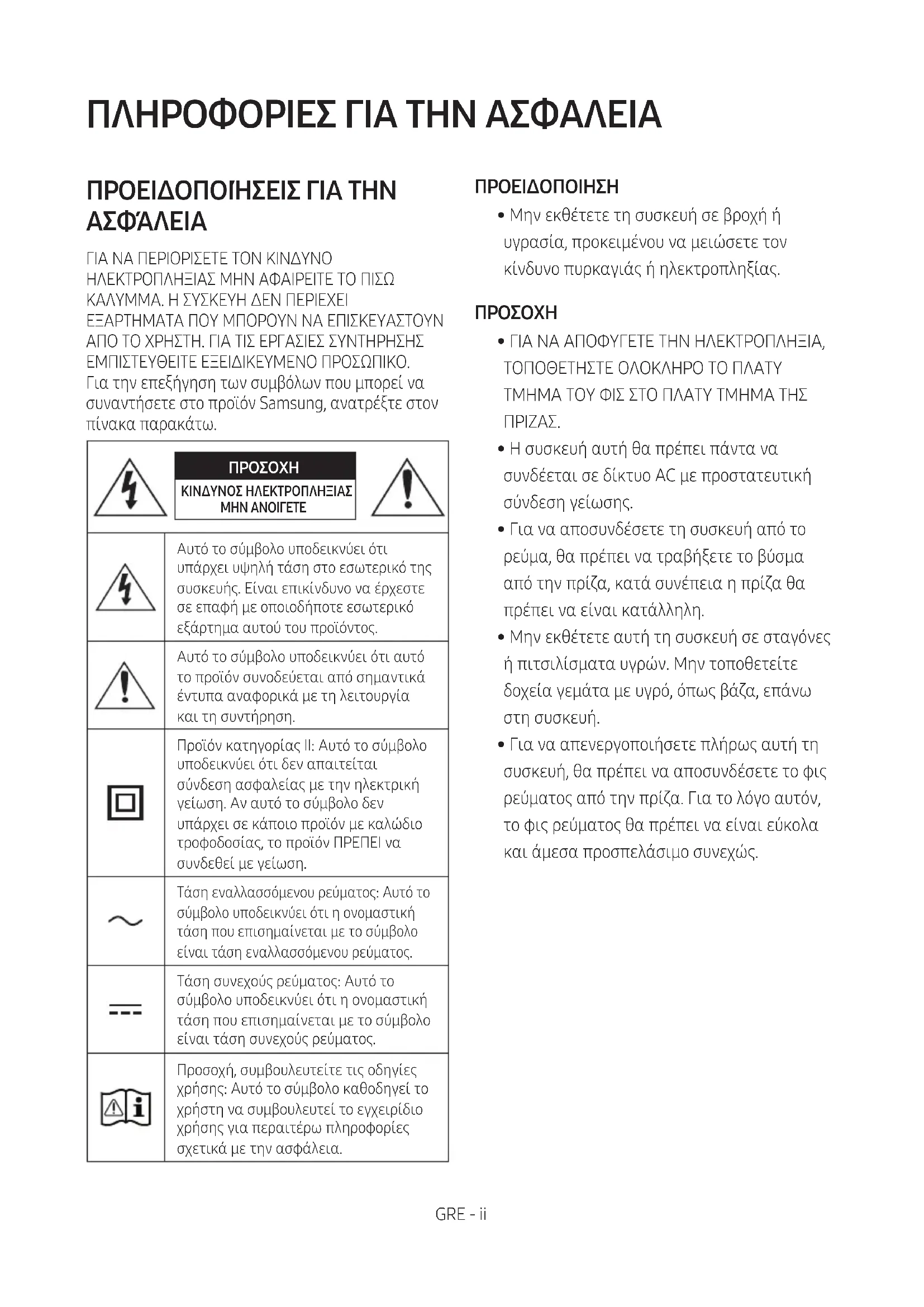 ΓΙΑ ΝΑ ΠΕΡΙΟΡΙΣΕΤΕ ΤΟΝ ΚΙΝΔΥΝΟ ΗΛΕΚΤΡΟΠΛΗΞΙΑΣ ΜΗΝ ΑΦΑΙΡΕΙΤΕ ΤΟ ΠΙΣΩ ΚΑΛΥΜΜΑ. Η ΣΥΣΚΕΥΗ ΔΕΝ ΠΕΡΙΕΧΕΙ ΕΞΑΡΤΗΜΑΤΑ ΠΟΥ ΜΠΟΡΟΥΝ ΝΑ ΕΠΙΣΚΕΥΑΣΤΟΥΝ ΑΠΟ ΤΟ ΧΡΗΣΤΗ. ΓΙΑ ΤΙΣ ΕΡΓΑΣΙΕΣ ΣΥΝΤΗΡΗΣΗΣ ΕΜΠΙΣΤΕΥΘΕΙΤΕ ΕΞΕΙΔΙΚΕΥΜΕΝΟ ΠΡΟΣΩΠΙΚΟ. Για την επεξήγηση των συμβόλων που μπορεί να συναντήσετε στο προϊόν Samsung, ανατρέξτε στον πίνακα παρακάτω.