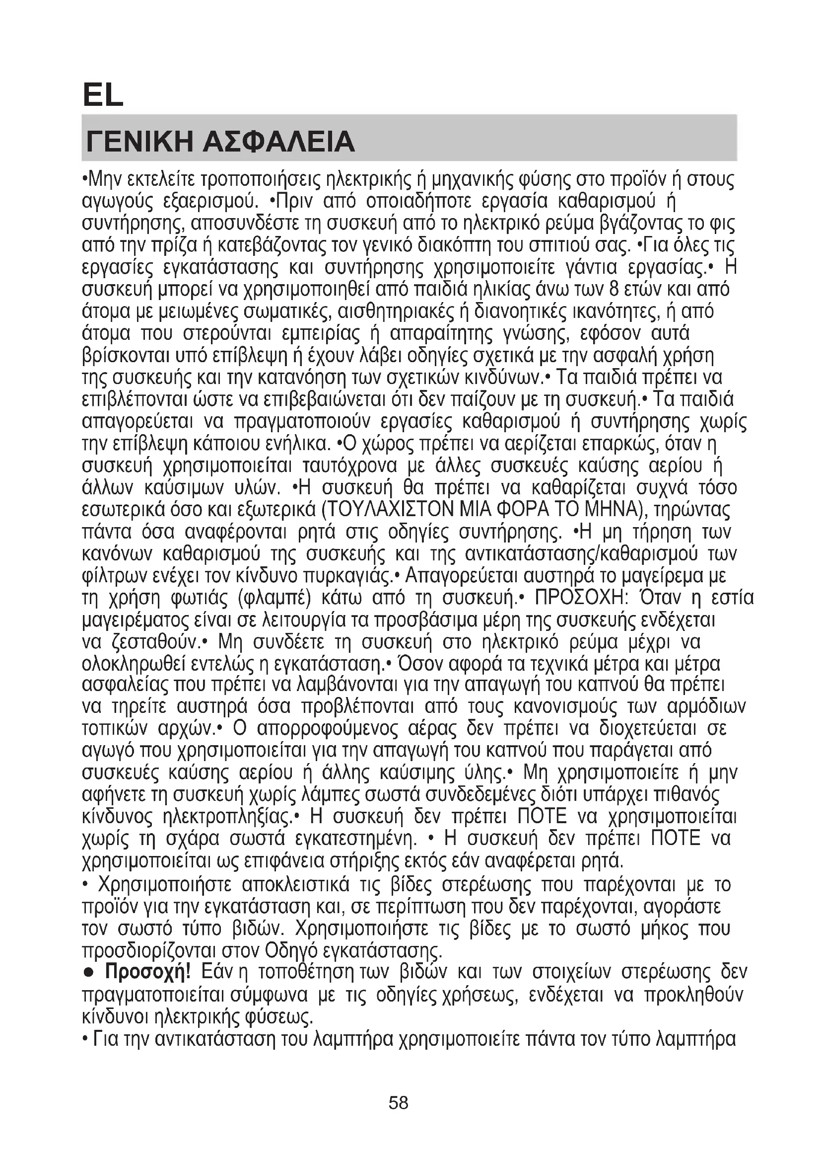 - Μην εκτελείτε τροποποιήσεις ηλεκτρικής ή μηχανικής φύσης στο προϊόν ή στους αγωγούς εξαερισμού. •Πριν από οποιαδήποτε εργασία καθαρισμού ή συντήρησης, αποσυνδέστε τη συσκευή από το ηλεκτρικό ρεύμα βγάζοντας το φις από την πρίζα ή κατεβάζοντας τον γενικό διακόπτη του σπιτιού σας. •Για όλες τις εργασίες εγκατάστασης και συντήρησης χρησιμοποιείτε γάντια εργασίας.• Η συσκευή μπορεί να χρησιμοποιηθεί από παιδιά ηλικίας άνω των 8 ετών και από άτομα με μειωμένες σωματικές, αισθητηριακές ή διανοητικές ικανότητες, ή από άτομα που στερούνται εμπειρίας ή απαραίτητης γνώσης, εφόσον αυτά βρίσκονται υπό επίβλεψη ή έχουν λάβει οδηγίες σχετικά με την ασφαλή χρήση της συσκευής και την κατανόηση των σχετικών κινδύνων.• Τα παιδιά πρέπει να επιβλέπονται ώστε να επιβεβαιώνεται ότι δεν παίζουν με τη συσκευή.• Τα παιδιά απαγορεύεται να πραγματοποιούν εργασίες καθαρισμού ή συντήρησης χωρίς την επίβλεψη κάποιου ενήλικα. •Ο χώρος πρέπει να αερίζεται επαρκώς, όταν η συσκευή χρησιμοποιείται ταυτόχρονα με άλλες συσκευές καύσης αερίου ή άλλων καύσιμων υλών. •Η συσκευή θα πρέπει να καθαρίζεται συχνά τόσο εσωτερικά όσο και εξωτερικά (ΤΟΥΛΑΧΙΣΤΟΝ ΜΙΑ ΦΟΡΑ ΤΟ ΜΗΝΑ), τηρώντας πάντα όσα αναφέρονται ρητά στις οδηγίες συντήρησης. •Η μη τήρηση των κανόνων καθαρισμού της συσκευής και της αντικατάστασης/καθαρισμού των φίλτρων ενέχει τον κίνδυνο πυρκαγιάς.• Απαγορεύεται αυστηρά το μαγείρεμα με τη χρήση φωτιάς (φλαμπέ) κάτω από τη συσκευή.• ΠΡΟΣΟΧΗ: Όταν η εστία μαγειρέματος είναι σε λειτουργία τα προσβάσιμα μέρη της συσκευής ενδέχεται να ζεσταθούν.• Μη συνδέετε τη συσκευή στο ηλεκτρικό ρεύμα μέχρι να ολοκληρωθεί εντελώς η εγκατάσταση.• Όσον αφορά τα τεχνικά μέτρα και μέτρα ασφαλείας που πρέπει να λαμβάνονται για την απαγωγή του καπνού θα πρέπει να τηρείτε αυστηρά όσα προβλέπονται από τους κανονισμούς των αρμόδιων τοπικών αρχών.• Ο απορροφούμενος αέρας δεν πρέπει να διοχετεύεται σε αγωγό που χρησιμοποιείται για την απαγωγή του καπνού που παράγεται από συσκευές καύσης αερίου ή άλλης καύσιμης ύλης.• Μη χρησιμοποιείτε ή μην αφήνετε τη συσκευή χωρίς λάμπες σωστά συνδεδεμένες διότι υπάρχει πιθανός κίνδυνος ηλεκτροπληξίας.• Η συσκευή δεν πρέπει ΠΟΤΕ να χρησιμοποιείται χωρίς τη σχάρα σωστά εγκατεστημένη. • Η συσκευή δεν πρέπει ΠΟΤΕ να χρησιμοποιείται ως επιφάνεια στήριξης εκτός εάν αναφέρεται ρητά.