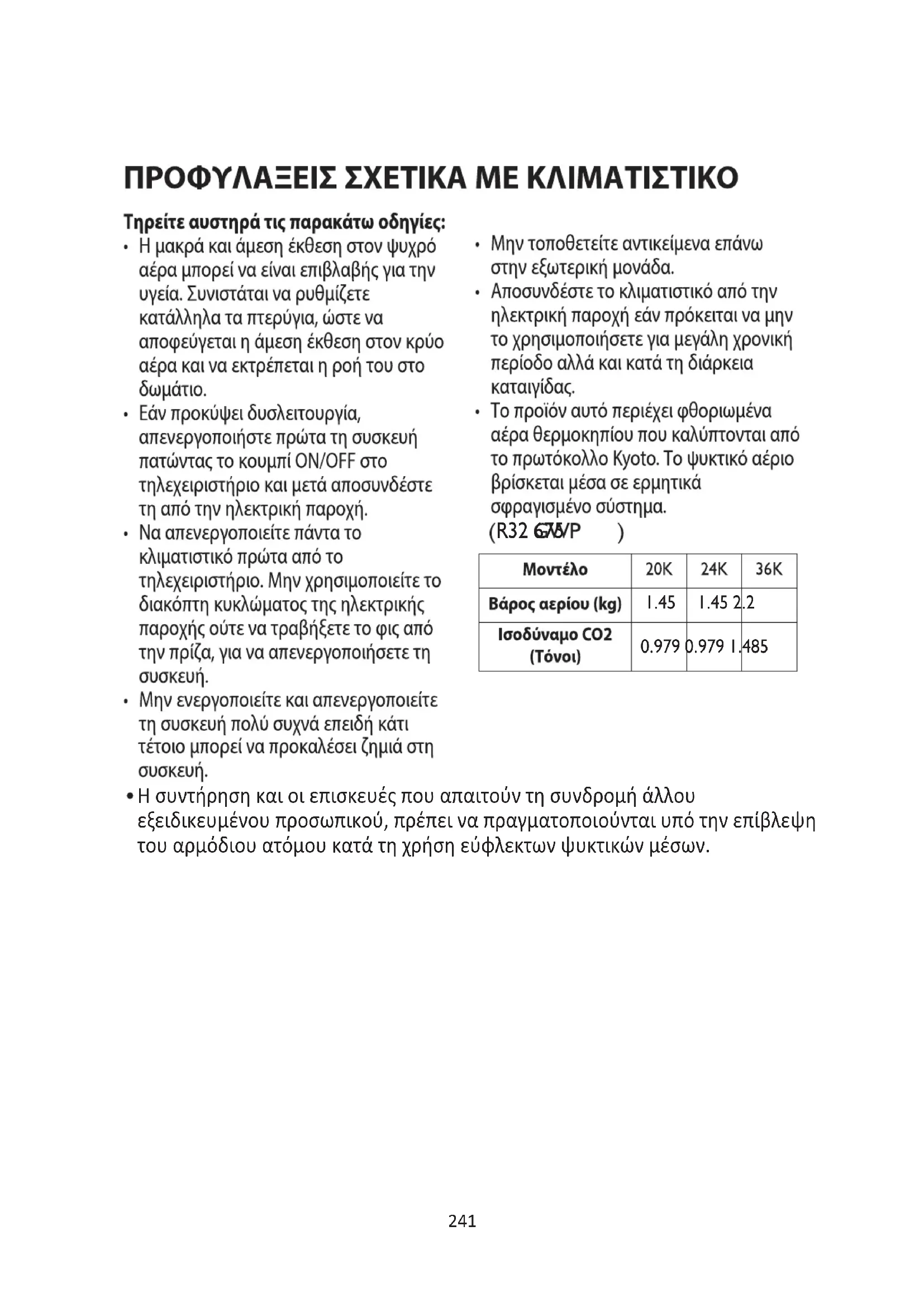 - Κάθε άτομο που ασχολείται με την επεξεργασία ή εργάζεται σε ένα κύκλωμα ψυκτικού πρέπει να διαθέτει έγκυρο πιστοποιητικό από μια αρχή αξιολόγησης διαπιστευμένη από τη βιομηχανία, η οποία εγκρίνει την αρμοδιότητά του να χειρίζεται ψυκτικά με ασφάλεια σύμφωνα με μια προδιαγραφή αξιολόγησης αναγνωρισμένη από τη βιομηχανία. Η συντήρηση πρέπει να εκτελείται μόνο σύμφωνα με τις οδηγίες του κατασκευαστή του εξοπλισμού. Η συντήρηση και οι επισκευές που απαιτούν τη συνδρομή άλλου εξειδικευμένου προσωπικού, πρέπει να πραγματοποιούνται υπό την επίβλεψη του αρμόδιου ατόμου κατά τη χρήση εύφλεκτων ψυκτικών μέσων. Η συσκευή πρέπει να εγκαθίσταται, να λειτουργεί και να αποθηκεύεται σε δωμάτιο με επιφάνεια δαπέδου άνω των 10 m2. Η εγκατάσταση των σωληνώσεων πρέπει να γίνεται σε δωμάτιο με επιφάνεια δαπέδου μεγαλύτερη από 10 m2. Οι σωληνώσεις πρέπει να συμμορφώνονται με τους εθνικούς κανονισμούς αερίου. Η μέγιστη ποσότητα φόρτωσης ψυκτικού μέσου είναι 2,5 kg. Οι μηχανικοί σύνδεσμοι που χρησιμοποιούνται σε εσωτερικούς χώρους πρέπει να συμμορφώνονται με το πρότυπο ISO 14903. Όταν οι μηχανικοί σύνδεσμοι επαναχρησιμοποιούνται σε εσωτερικό χώρο, τα τμήματα στεγανοποίησης πρέπει να ανανεώνονται. Όταν επαναχρησιμοποιούνται σύνδεσμοι ρακόρ σε εσωτερικό χώρο, το χείλος πρέπει να ανακατασκευάζεται. Η εγκατάσταση σωληνώσεων πρέπει να περιορίζεται στο ελάχιστο. Οι μηχανικές συνδέσεις είναι προσιτές για λόγους συντήρησης.