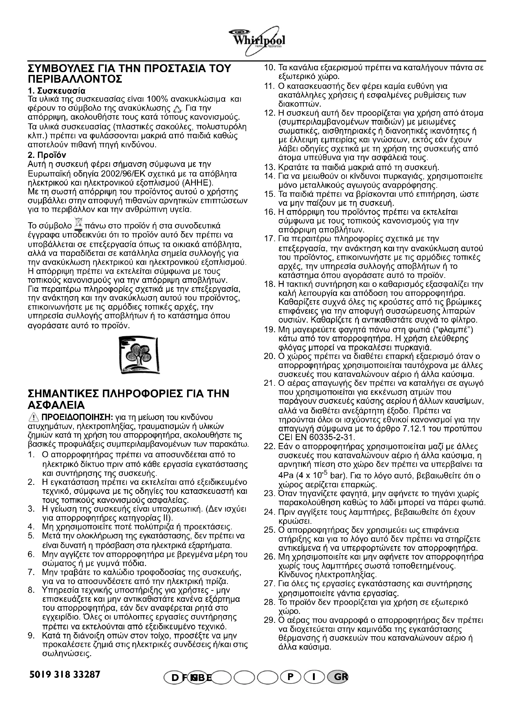 πρέπει να εκτελεστεί επισκευή, απευθυνθείτε στο εξουσιοδοτημένο Σέρβις (για να διασφαλιστεί η χρήση γνήσιων ανταλλακτικών και η ορθή επισκευή). Η μη τήρηση αυτών των οδηγιών μπορεί να επηρεάσει την ασφάλεια και την ποιότητα του προϊόντος.5019 318 33287 Μη συνδέετε τη συσκευή στο ηλεκτρικό ρεύμα πριν από την ολοκλήρωση της εγκατάστασης.
