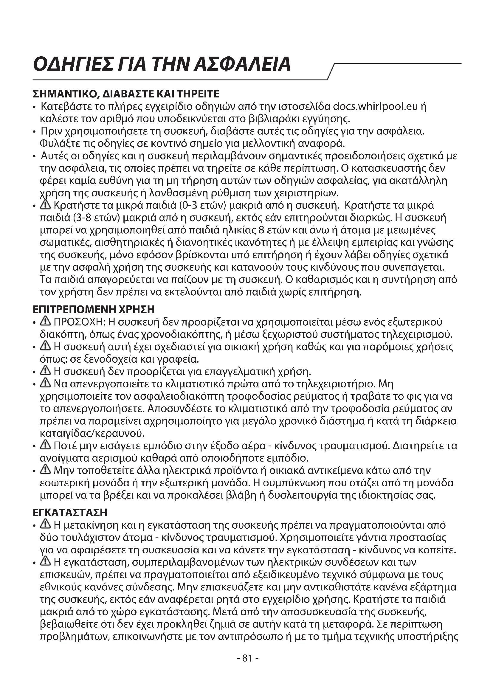 - Κατεβάστε το πλήρες εγχειρίδιο οδηγιών από την ιστοσελίδα docs.whirlpool.eu ή καλέστε τον αριθμό που υποδεικνύεται στο βιβλιαράκι εγγύησης.