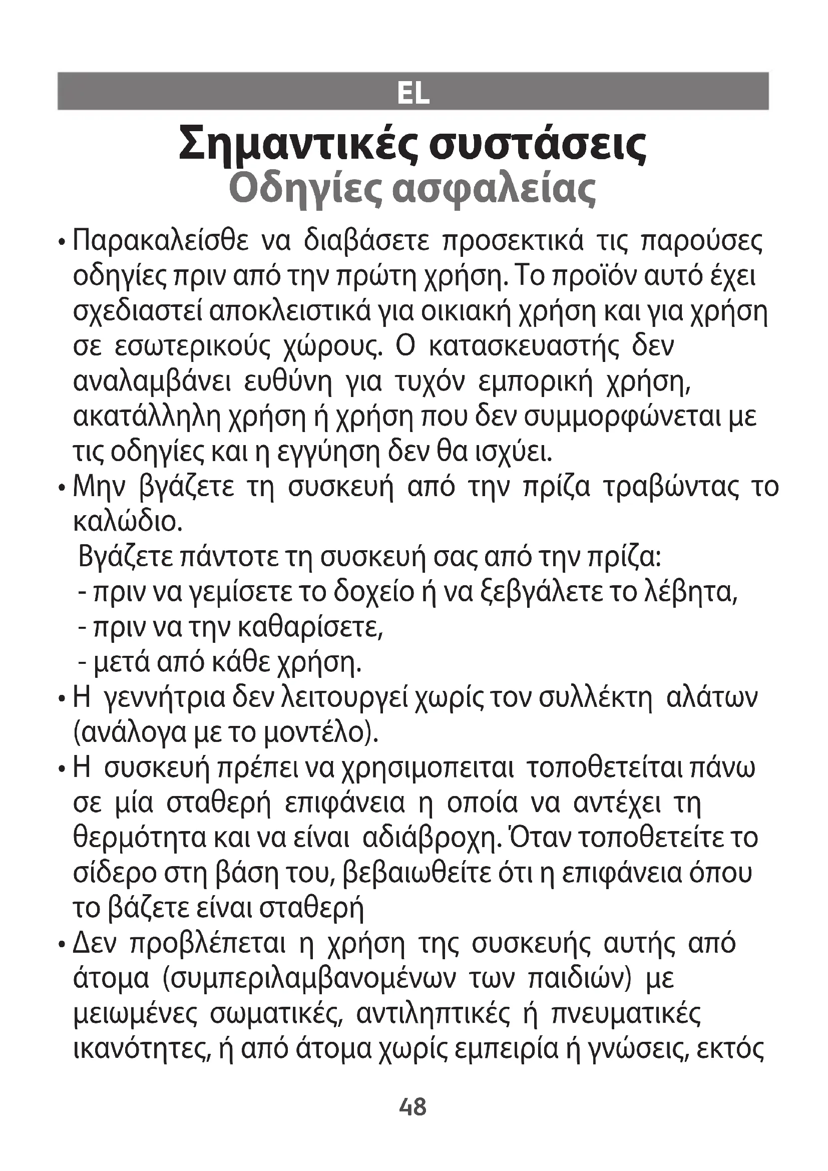 1800139811-STEAM-STATIONS-SAFETIES-V6.qxp_110x154 01/06/2016 15:21 Page47EL Σημαντικές συστάσεις Οδηγίες ασφαλείας
