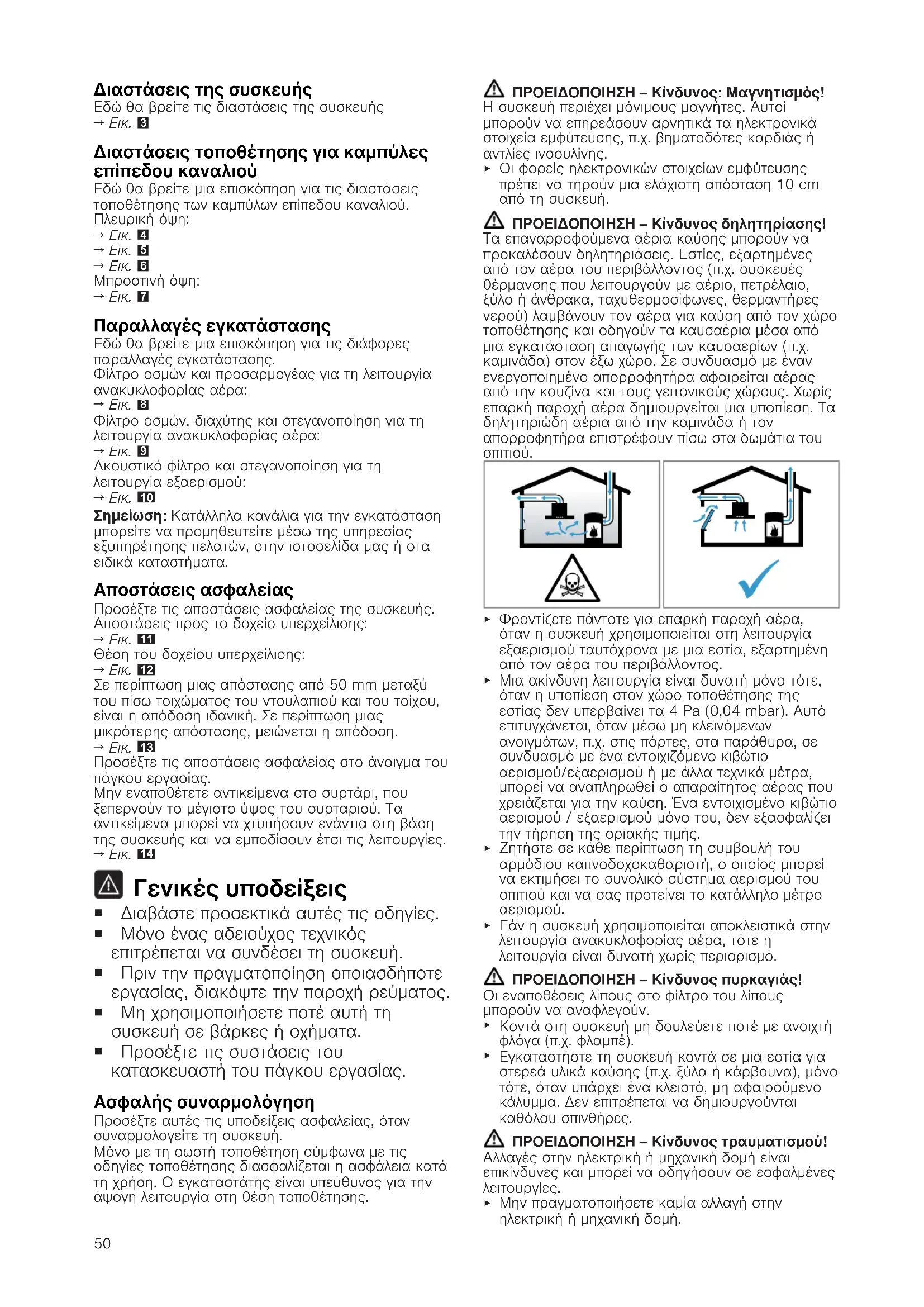 Οι φορείς ηλεκτρονικών στοιχείων εμφύτευσης πρέπει να τηρούν μια ελάχιστη απόσταση 10 cm από τη συσκευή. ΠΡΟΕΙΔΟΠΟΙΗΣΗ‒Κίνδυνος δηλητηρίασης! Τα επαναρροφούμενα αέρια καύσης μπορούν να προκαλέσουν δηλητηριάσεις. Εστίες, εξαρτημένες από τον αέρα του περιβάλλοντος (π.χ. συσκευές θέρμανσης που λειτουργούν με αέριο, πετρέλαιο, ξύλο ή άνθρακα, ταχυθερμοσίφωνες, θερμαντήρες νερού) λαμβάνουν τον αέρα για καύση από τον χώρο τοποθέτησης και οδηγούν τα καυσαέρια μέσα από μια εγκατάσταση απαγωγής των καυσαερίων (π.χ. καμινάδα) στον έξω χώρο. Σε συνδυασμό με έναν ενεργοποιημένο απορροφητήρα αφαιρείται αέρας από την κουζίνα και τους γειτονικούς χώρους. Χωρίς επαρκή παροχή αέρα δημιουργείται μια υποπίεση. Τα δηλητηριώδη αέρια από την καμινάδα ή τον απορροφητήρα επιστρέφουν πίσω στα δωμάτια του