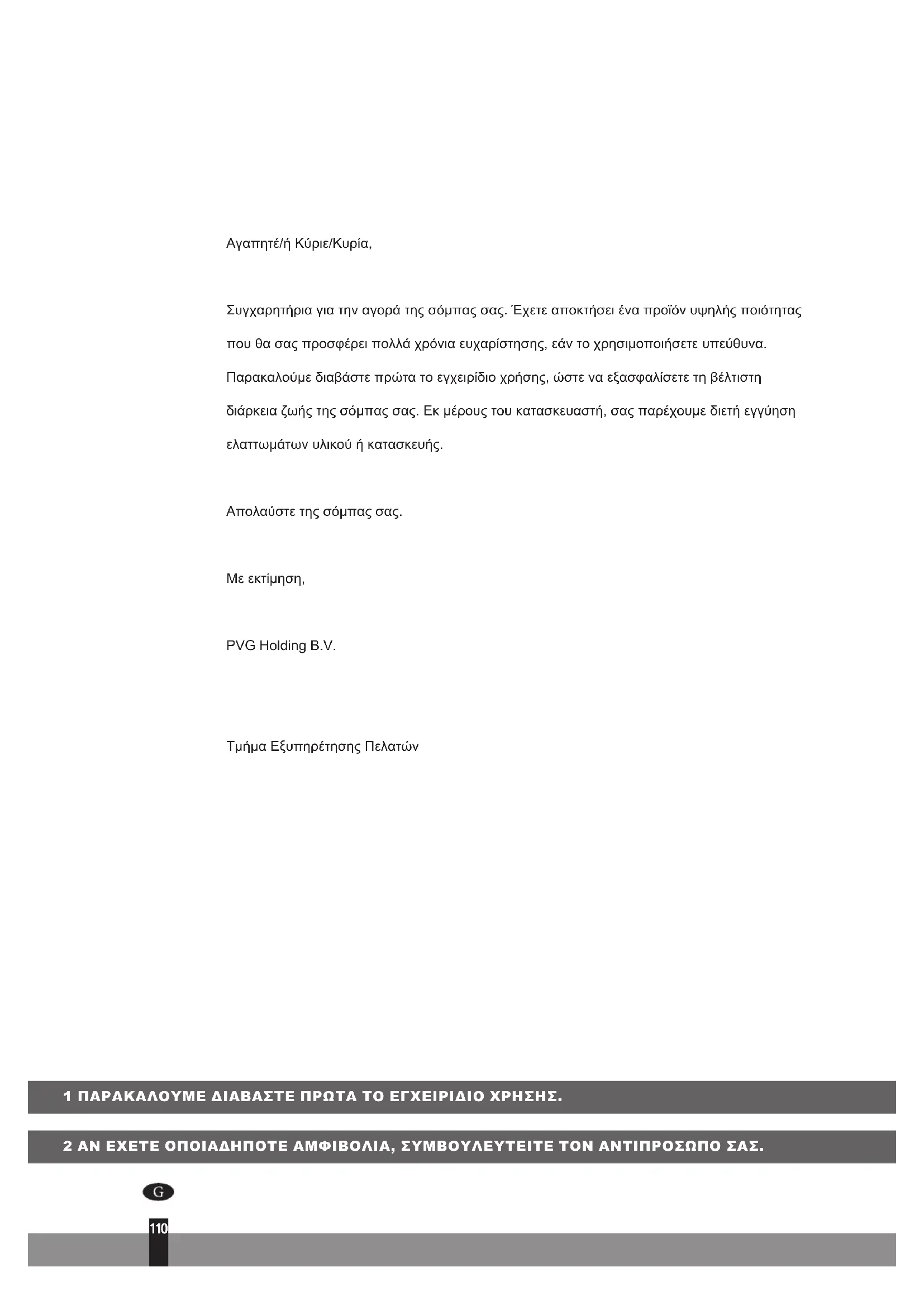 - Εξαιρετικά εύφλεκτες ουσίες μπορούν να προκαλέσουν ανεξέλεγκτη καύση, προκαλώντας τις φλόγες να ξεσπάσουν έξω. Σε περίπτωση που συμβεί αυτό, μην προσπαθήσετε ποτέ να μετακινήσετε τη θερμάστρα αλλά, πάντοτε, σβήστε αμέσως τη θερμάστρα. Σε περίπτωση έκτακτης ανάγκης, μπορείτε να χρησιμοποιήσετε έναν πυροσβεστήρα αλλά μόνο πυροσβεστήρα τύπου Β: έναν πυροσβεστήρα διοξειδίου του άνθρακα ή ξηράς κόνεως.125126 Dear Sir, Madam, Congratulations with your purchase of a portable domestic heater. You have purchased a quality product, which will serve you for many years to come. This, of course, provided you use the heater correctly. Please read these Directions for Use first, to ensure maximum lifetime for your heater. Your heater comes with a 48-month manufacturer’s warranty on all defects in materials or workmanship. We wish you a warm and comfortable time with your heater. Yours sincerely, PVG Holding b.v. Customer Service Department 1 READ THE DIRECTIONS FOR USE FIRST. 2 IN CASE OF ANY DOUBT, CONTACT YOUR DEALER.