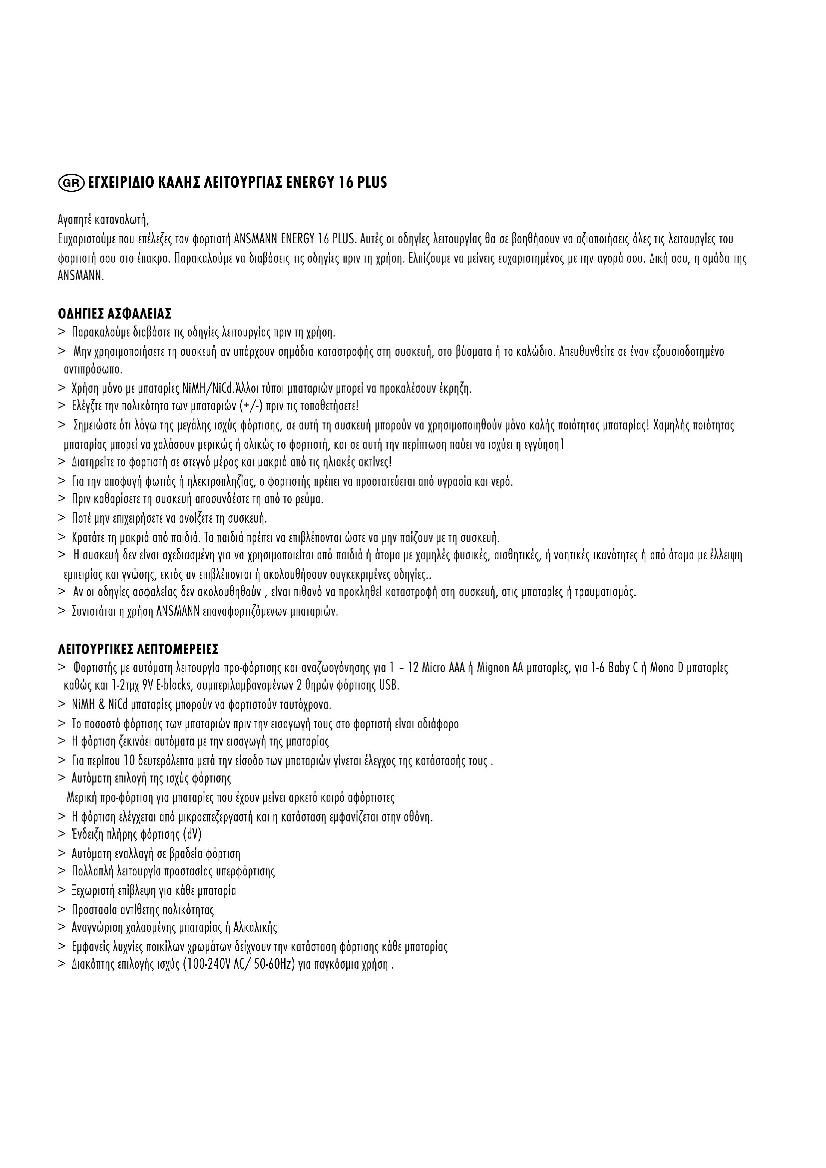 Eγχειριδιο καλής λειτουργιας ENERGY 16 PLUS Αγαπητέ καταναλωτή, Ευχαριστούμε που επέλεξες τον φορτιστή ANSMANN ENERGY 16 PLUS. Αυτές οι οδηγίες λειτουργίας θα σε βοηθήσουν να αξιοποιήσεις όλες τις λειτουργίες του φορτιστή σου στο έπακρο. Παρακαλούμε να διαβάσεις τις οδηγίες πριν τη χρήση. Ελπίζουμε να μείνεις ευχαριστημένος με την αγορά σου. Δική σου, η ομάδα της ANSMANN. οδήγιες αςΦαλειας > Παρακαλούμε διαβάστε τις οδηγίες λειτουργίας πριν τη χρήση. > Μην χρησιμοποιήσετε τη συσκευή αν υπάρχουν σημάδια καταστροφής στη συσκευή, στο βύσματα ή το καλώδιο. Απευθυνθείτε σε έναν εξουσιοδοτημένο αντιπρόσωπο. > Χρήση μόνο με μπαταρίες NiMH/NiCd.Άλλοι τύποι μπαταριών μπορεί να προκαλέσουν έκρηξη. > Ελέγξτε την πολικότητα των μπαταριών (+/-) πριν τις τοποθετήσετε! > Σημειώστε ότι λόγω της μεγάλης ισχύς φόρτισης, σε αυτή τη συσκευή μπορούν να χρησιμοποιηθούν μόνο καλής ποιότητας μπαταρίας! Χαμηλής ποιότητας μπαταρίας μπορεί να χαλάσουν μερικώς ή ολικώς το φορτιστή, και σε αυτή την περίπτωση παύει να ισχύει η εγγύηση1 > Διατηρείτε το φορτιστή σε στεγνό μέρος και μακριά από τις ηλιακές ακτίνες! > Για την αποφυγή φωτιάς ή ηλεκτροπληξίας, ο φορτιστής πρέπει να προστατεύεται από υγρασία και νερό. > Πριν καθαρίσετε τη συσκευή αποσυνδέστε τη από το ρεύμα. > Ποτέ μην επιχειρήσετε να ανοίξετε τη συσκευή. > Κρατάτε τη μακριά από παιδιά. Τα παιδιά πρέπει να επιβλέπονται ώστε να μην παίζουν με τη συσκευή. > Η συσκευή δεν είναι σχεδιασμένη για να χρησιμοποιείται από παιδιά ή άτομα με χαμηλές φυσικές, αισθητικές, ή νοητικές ικανότητες ή από άτομα με έλλειψη εμπειρίας και γνώσης, εκτός αν επιβλέπονται ή ακολουθήσουν συγκεκριμένες οδηγίες.. > Αν οι οδηγίες ασφαλείας δεν ακολουθηθούν , είναι πιθανό να προκληθεί καταστροφή στη συσκευή, στις μπαταρίες ή τραυματισμός. > Συνιστάται η χρήση ANSMANN επαναφορτιζόμενων μπαταριών. λειτουργικες λεΠτοΜερειες > Φορτιστής με αυτόματη λειτουργία προ-φόρτισης και αναζωογόνησης για 1 – 12 Micro AAA ή Mignon AA μπαταρίες, για 1-6 Baby C ή Mono D μπαταρίες καθώς και 1-2τμχ 9V E-blocks, συμπεριλαμβανομένων 2 θηρών φόρτισης USB. > ΝiMH & NiCd μπαταρίες μπορούν να φορτιστούν ταυτόχρονα. > Το ποσοστό φόρτισης των μπαταριών πριν την εισαγωγή τους στο φορτιστή είναι αδιάφορο > Η φόρτιση ξεκινάει αυτόματα με την εισαγωγή της μπαταρίας > Για περίπου 10 δευτερόλεπτα μετά την είσοδο των μπαταριών γίνεται έλεγχος της κατάστασής τους . > Αυτόματη επιλογή της ισχύς φόρτισης Μερική προ-φόρτιση για μπαταρίες που έχουν μείνει αρκετό καιρό αφόρτιστες > Η φόρτιση ελέγχεται από μικροεπεξεργαστή και η κατάσταση εμφανίζεται στην οθόνη. > Ένδειξη πλήρης φόρτισης (dV) > Αυτόματη εναλλαγή σε βραδεία φόρτιση > Πολλαπλή λειτουργία προστασίας υπερφόρτισης > Ξεχωριστή επίβλεψη για κάθε μπαταρία > Προστασία αντίθετης πολικότητας > Αναγνώριση χαλασμένης μπαταρίας ή Αλκαλικής > Εμφανείς λυχνίες ποικίλων χρωμάτων δείχνουν την κατάσταση φόρτισης κάθε μπαταρίας > Διακόπτης επιλογής ισχύς (100-240V AC/ 50-60Hz) για παγκόσμια χρήση .λειτουργια Συνδέστε τον φορτιστή στο ρεύμα (100-240V AC/ 50-60Hz) και ανοίξτε τον διακόπτη. Για να εισάγετε κυλινδρικές μπαταρίες , μετακινείστε την ασημένια μεταλλική γέφυρα προς τα κάτω και τοποθετείστε την επαναφορτιζόμενη μπαταρία στο κάτω μέρος της συσκευής. Ο φορτιστής διαθέτει 6 θέσεις για κυλινδρικές μπαταρίες. Σε κάθε μία από αυτές τις θέσεις μπορείτε να τοποθετήσετε 2 Micro AAA ή Mignon AA μπαταρίες ή 1 Baby C ή Mono D 
