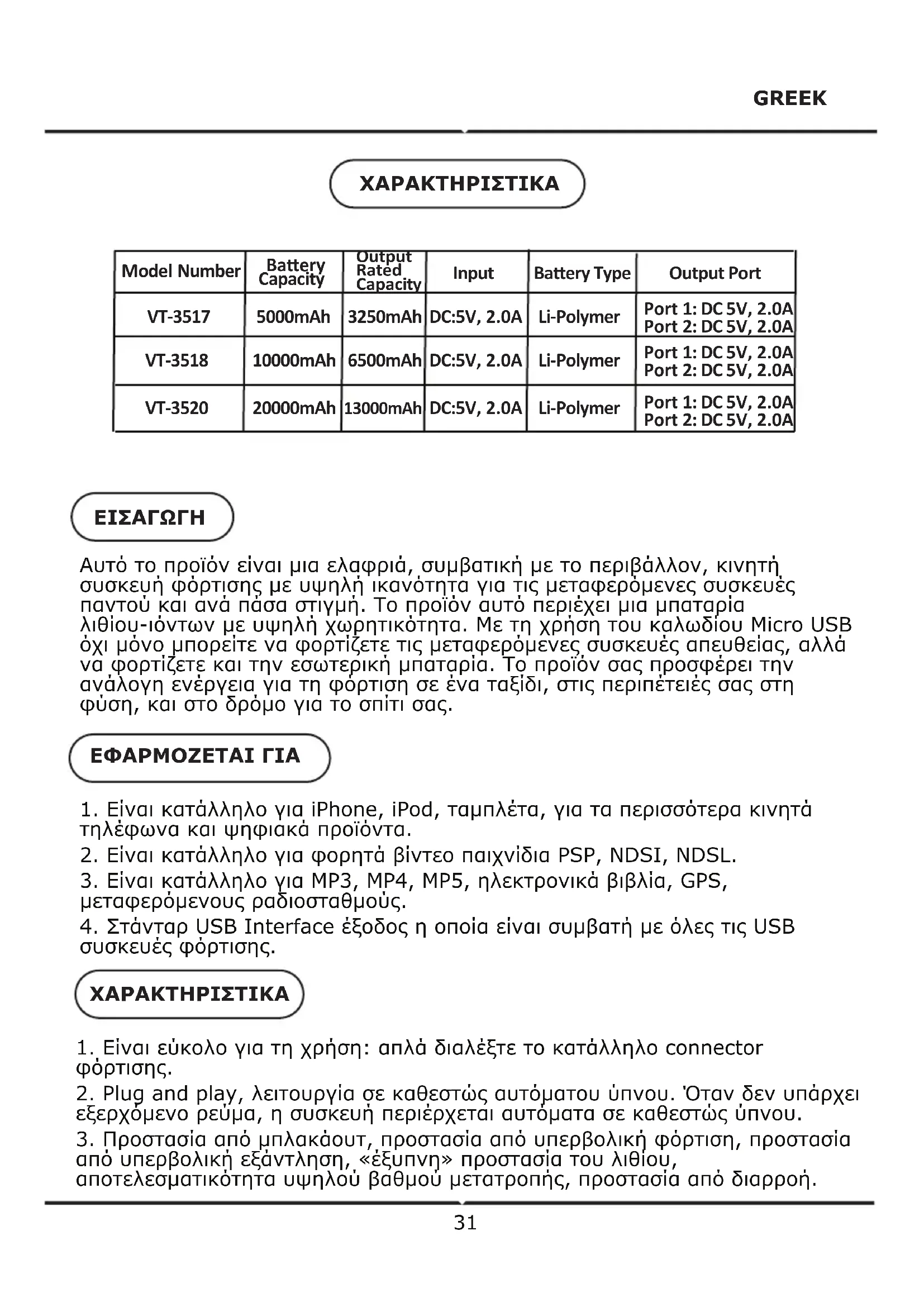 Output Rated Capacity Model Number Input Baery Type Output Port 5000mAh 10000mAh 20000mAh VT-3517 VT-3518 VT-3520 DC:5V, 2.0A DC:5V, 2.0A DC:5V, 2.0A Li-Polymer Li-Polymer Li-Polymer Port 1: DC 5V, 2.0A Port 2: DC 5V, 2.0A Port 1: DC 5V, 2.0A Port 2: DC 5V, 2.0A Port 1: DC 5V, 2.0A Port 2: DC 5V, 2.0A Baery Capacity 3250mAh 6500mAh 13000mAh1. Χωρητικότητα του display (Παρατήρηση: Εφαρμόζεται για τα μοντέλα με LED δείκτη): Πατήστε το κουμπί ελέγχου, το LED χωρητικότητας θα ενεργοποιηθεί, και σε 10 δευτερόλεπτα θα κλείσει αυτόματα. 4 Περιλαμβάνονται LEDs: απομένουν 75%~100%. 3 Περιλαμβάνονται LEDs: απομένουν 50%~75%. 2 Περιλαμβάνονται LEDs: 25% - απομένουν 50%. 1 Περιλαμβάνονται LEDs: απομένουν λιγότερο από 25%.