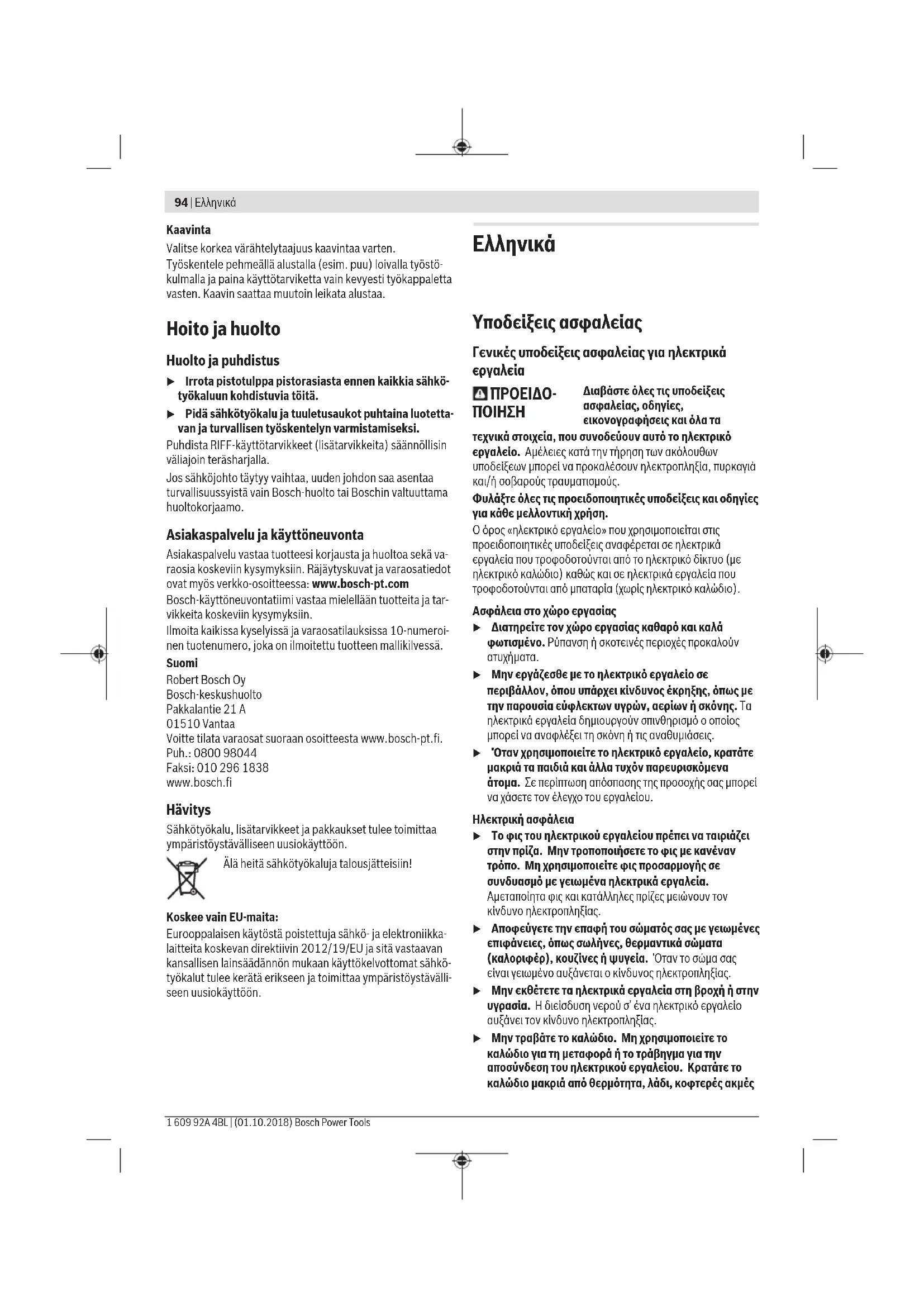 Για το ξύσιμο επιλέξτε μια βαθμίδα υψηλού αριθμού ταλαντώσεων. Στα μαλακά υποστρώματα (π.χ. ξύλο) να εργάζεστε με μικρή γωνία και με χαμηλή δύναμη προσπίεσης. Διαφορετικά η σπάτουλα μπορεί να κόψει το υπόστρωμα. Συντήρηση και σέρβις Συντήρηση και καθαρισμός u Βγάζετε το φις από την πρίζα πριν από οποιαδήποτε εργασία στο ηλεκτρικό εργαλείο. u Να διατηρείτε το ηλεκτρικό εργαλείο και τις σχισμές αερισμού πάντοτε σε καθαρή κατάσταση για να μπορείτε να εργάζεσθε καλά και με ασφάλεια. Καθαρίζετε τα εξαρτήματα Riff (ειδικά εξαρτήματα) τακτικά με μια συρματόβουρτσα. Μια τυχόν αναγκαία αντικατάσταση του ηλεκτρικού καλωδίου πρέπει να διεξαχθεί από την Bosch ή από ένα εξουσιοδοτημένο κέντρο σέρβις της Bosch, για να αποφευχθεί έτσι κάθε κίνδυνος της ασφάλειας. Εξυπηρέτηση πελατών και συμβουλές εφαρμογής Η υπηρεσία εξυπηρέτησης πελατών απαντά στις ερωτήσεις σας σχετικά με την επισκευή και τη συντήρηση του προϊόντος σας καθώς και για τα αντίστοιχα ανταλλακτικά. Σχέδια συναρμολόγησης και πληροφορίες για τα ανταλλακτικα θα βρείτε επίσης κάτω από: www.bosch-pt.com Η ομάδα παροχής συμβουλών της Bosch απαντά ευχαρίστως τις ερωτήσεις σας για τα προϊόντα μας και τα εξαρτήματά τους. Δώστε σε όλες τις ερωτήσεις και παραγγελίες ανταλλακτικών οπωσδήποτε τον 10ψήφιο κωδικό αριθμό σύμφωνα με την πινακίδα τύπου του προϊόντος.