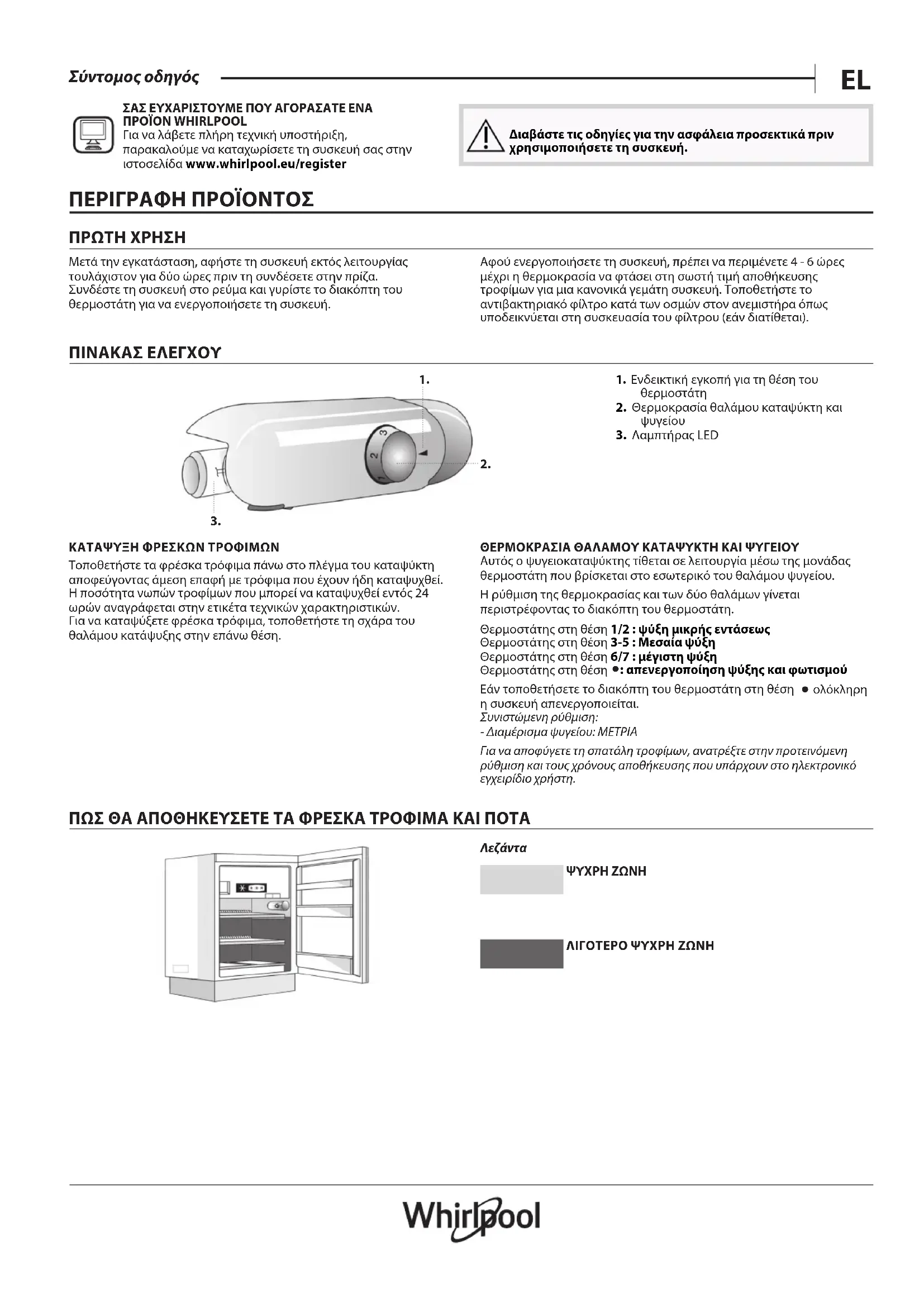 - Sammuta tuuletin (jos sellainen on), josta on kerrottu kappaleessa “TUULETIN”.EL Σύντομος οδηγός ΣΑΣ ΕΥΧΑΡΙΣΤΟΥΜΕ ΠΟΥ ΑΓΟΡΑΣΑΤΕ ΕΝΑ ΠΡΟΪΟΝ WHIRLPOOL Για να λάβετε πλήρη τεχνική υποστήριξη, παρακαλούμε να καταχωρίσετε τη συσκευή σας στην ιστοσελίδα www . whirlpool . eu/ register Διαβάστε τις οδηγίες για την ασφάλεια προσεκτικά πριν χρησιμοποιήσετε τη συσκευή. ΠΕΡΙΓΡΑΦΗ ΠΡΟΪΟΝΤΟΣ ΠΡΩΤΗ ΧΡΗΣΗ Μετά την εγκατάσταση, αφήστε τη συσκευή εκτός λειτουργίας τουλάχιστον για δύο ώρες πριν τη συνδέσετε στην πρίζα. Συνδέστε τη συσκευή στο ρεύμα και γυρίστε το διακόπτη του θερμοστάτη για να ενεργοποιήσετε τη συσκευή. Αφού ενεργοποιήσετε τη συσκευή, πρέπει να περιμένετε 4 - 6 ώρες μέχρι η θερμοκρασία να φτάσει στη σωστή τιμή αποθήκευσης τροφίμων για μια κανονικά γεμάτη συσκευή. Τοποθετήστε το αντιβακτηριακό φίλτρο κατά των οσμών στον ανεμιστήρα όπως υποδεικνύεται στη συσκευασία του φίλτρου (εάν διατίθεται). ΠΙΝΑΚΑΣ ΕΛΕΓΧΟΥ
