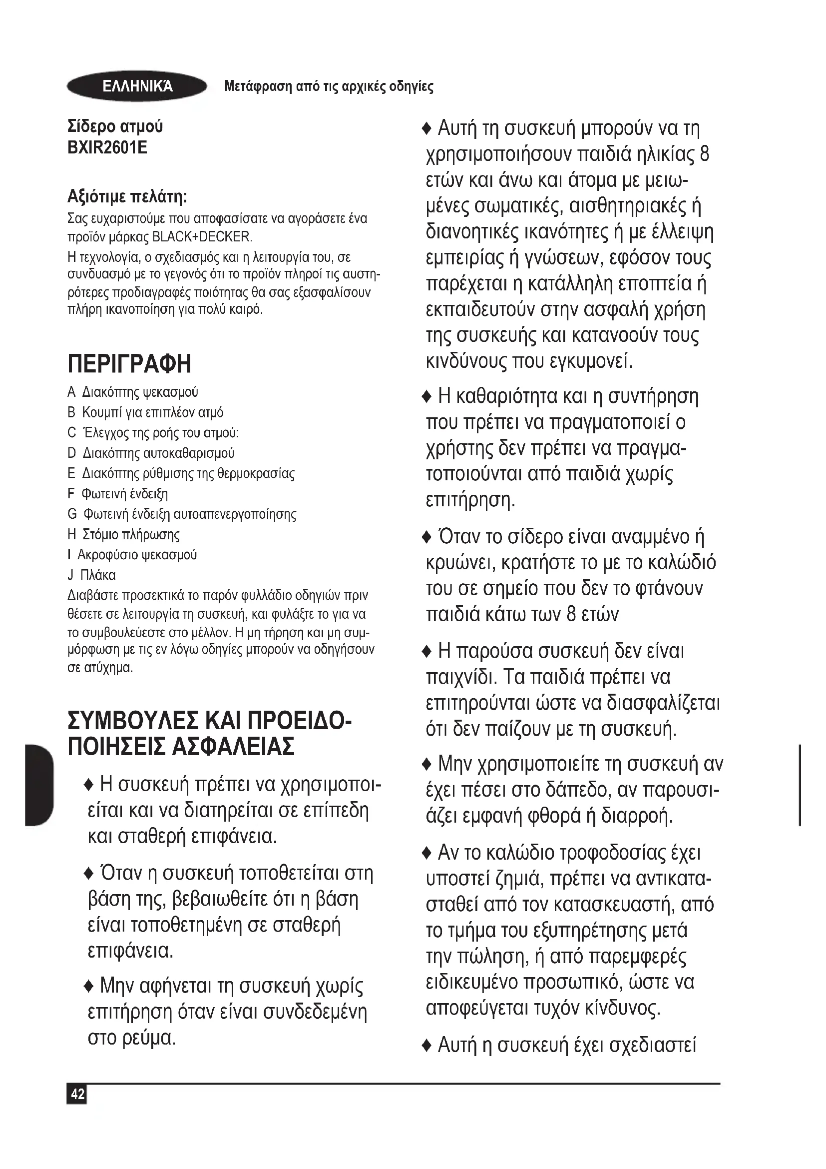 Σίδερο ατμού BXIR2601E Αξιότιμε πελάτη: Σας ευχαριστούμε που αποφασίσατε να αγοράσετε ένα προϊόν μάρκας BLACK+DECKER. Η τεχνολογία, ο σχεδιασμός και η λειτουργία του, σε συνδυασμό με το γεγονός ότι το προϊόν πληροί τις αυστη- ρότερες προδιαγραφές ποιότητας θα σας εξασφαλίσουν πλήρη ικανοποίηση για πολύ καιρό.