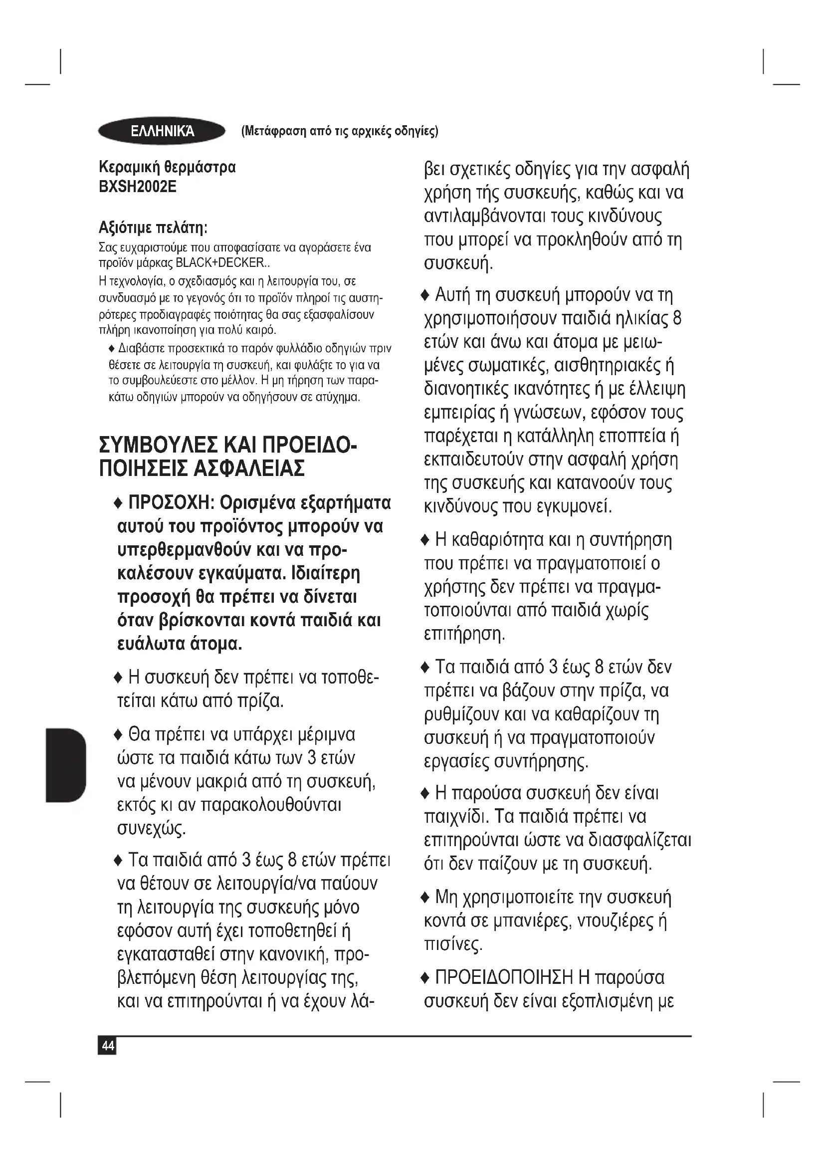 Κεραμική θερμάστρα BXSH2002E Αξιότιμε πελάτη: Σας ευχαριστούμε που αποφασίσατε να αγοράσετε ένα προϊόν μάρκας BLACK+DECKER.. Η τεχνολογία, ο σχεδιασμός και η λειτουργία του, σε συνδυασμό με το γεγονός ότι το προϊόν πληροί τις αυστη- ρότερες προδιαγραφές ποιότητας θα σας εξασφαλίσουν πλήρη ικανοποίηση για πολύ καιρό. ♦ Διαβάστε προσεκτικά το παρόν φυλλάδιο οδηγιών πριν θέσετε σε λειτουργία τη συσκευή, και φυλάξτε το για να το συμβουλεύεστε στο μέλλον. Η μη τήρηση των παρα- κάτω οδηγιών μπορούν να οδηγήσουν σε ατύχημα. ΣΥΜΒΟΥΛΈΣ ΚΑΙ ΠΡΟΈΙΔΟ- ΠΟΙΉΣΈΙΣ ΑΣΦΑΛΈΙΑΣ ♦ ΠΡΟΣΟΧΉ: Ορισμένα εξαρτήματα αυτού του προϊόντος μπορούν να υπερθερμανθούν και να προ- καλέσουν εγκαύματα. Ιδιαίτερη προσοχή θα πρέπει να δίνεται όταν βρίσκονται κοντά παιδιά και ευάλωτα άτομα. ♦ Η συσκευή δεν πρέπει να τοποθε- τείται κάτω από πρίζα. ♦ Θα πρέπει να υπάρχει μέριμνα ώστε τα παιδιά κάτω των 3 ετών να μένουν μακριά από τη συσκευή, εκτός κι αν παρακολουθούνται