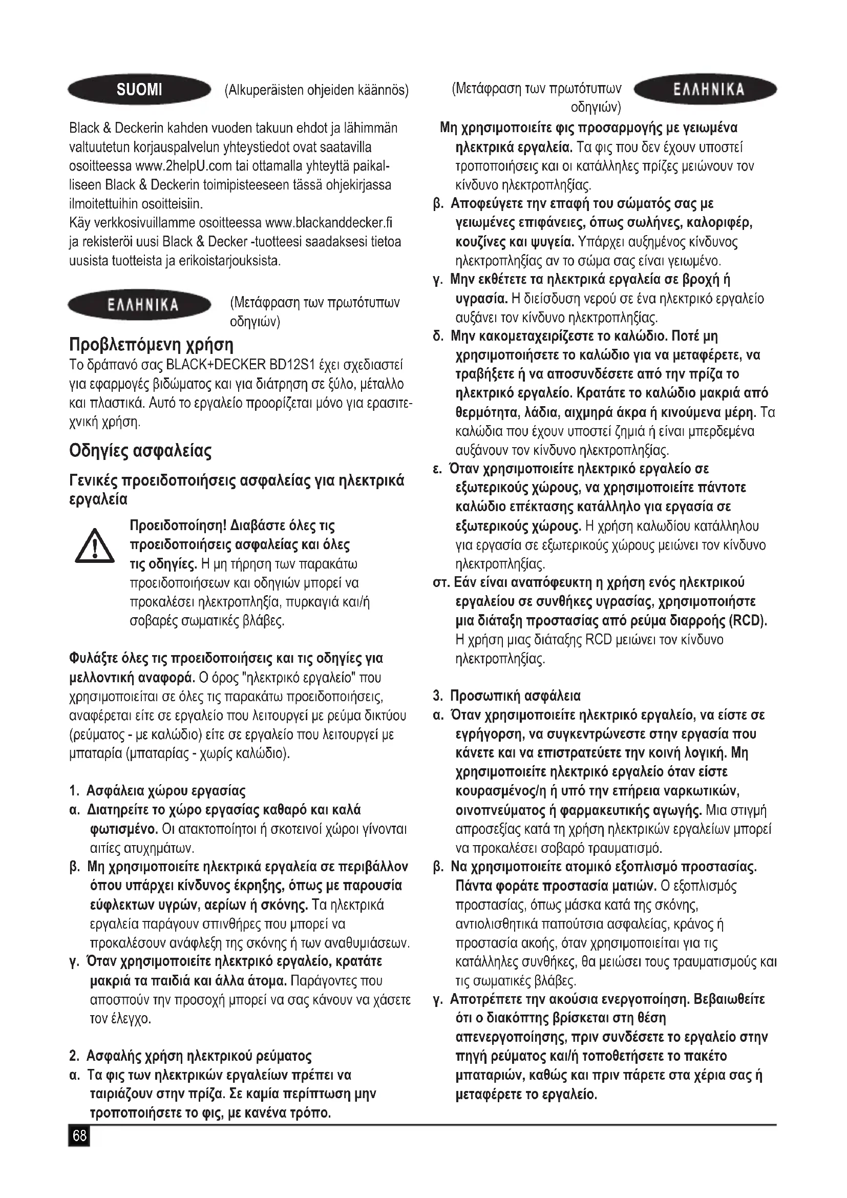 Προβλεπόμενη χρήση Το δράπανό σας BLACK+DECKER BD12S1 έχει σχεδιαστεί για εφαρμογές βιδώματος και για διάτρηση σε ξύλο, μέταλλο και πλαστικά. Αυτό το εργαλείο προορίζεται μόνο για ερασιτε- χνική χρήση. Οδηγίες ασφαλείας Γενικές προειδοποιήσεις ασφαλείας για ηλεκτρικά