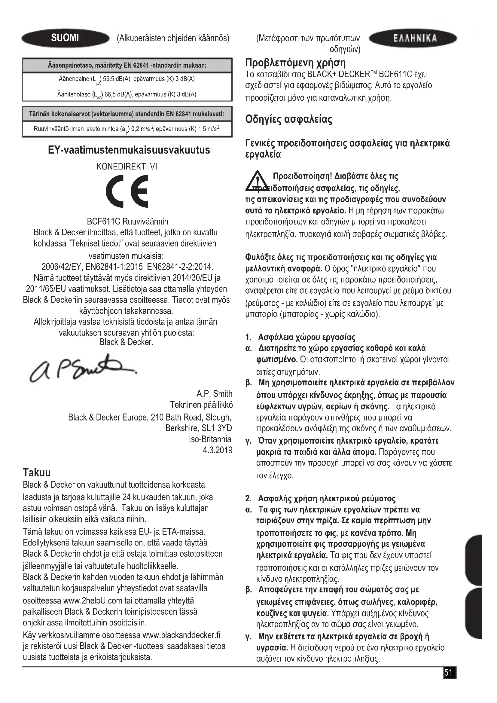 BCF611C - Κατσαβίδι Η Black & Decker δηλώνει ότι τα προϊόντα αυτά που περιγράφονται στα "τεχνικά δεδομένα" συμμορφώνονται με τα ακόλουθα: 2006/42/ΕΚ, EN62841-1:2015,EN62841-2-2:2014. Αυτά τα προϊόντα συμμορφώνονται και με την Οδηγία 2014/30/ΕΕ και 2011/65/ΕΕ. Για περισσότερες πληροφορίες, επικοινωνήστε με την Black & Decker στην παρακάτω διεύθυνση ή ανατρέξτε στο πίσω μέρος του εγχειριδίου. Ο κάτωθι υπογεγραμμένος είναι υπεύθυνος για την κατάρτιση του τεχνικού φακέλου και κάνει αυτή τη δήλωση για λογαριασμό της Black & Decker. A.P. Smith Τεχνικός Διευθυντής Black & Decker Europe, 210 Bath Road, Slough, Berkshire, SL1 3YD United Kingdom (Ηνωμένο Βασίλειο) 04/03/2019