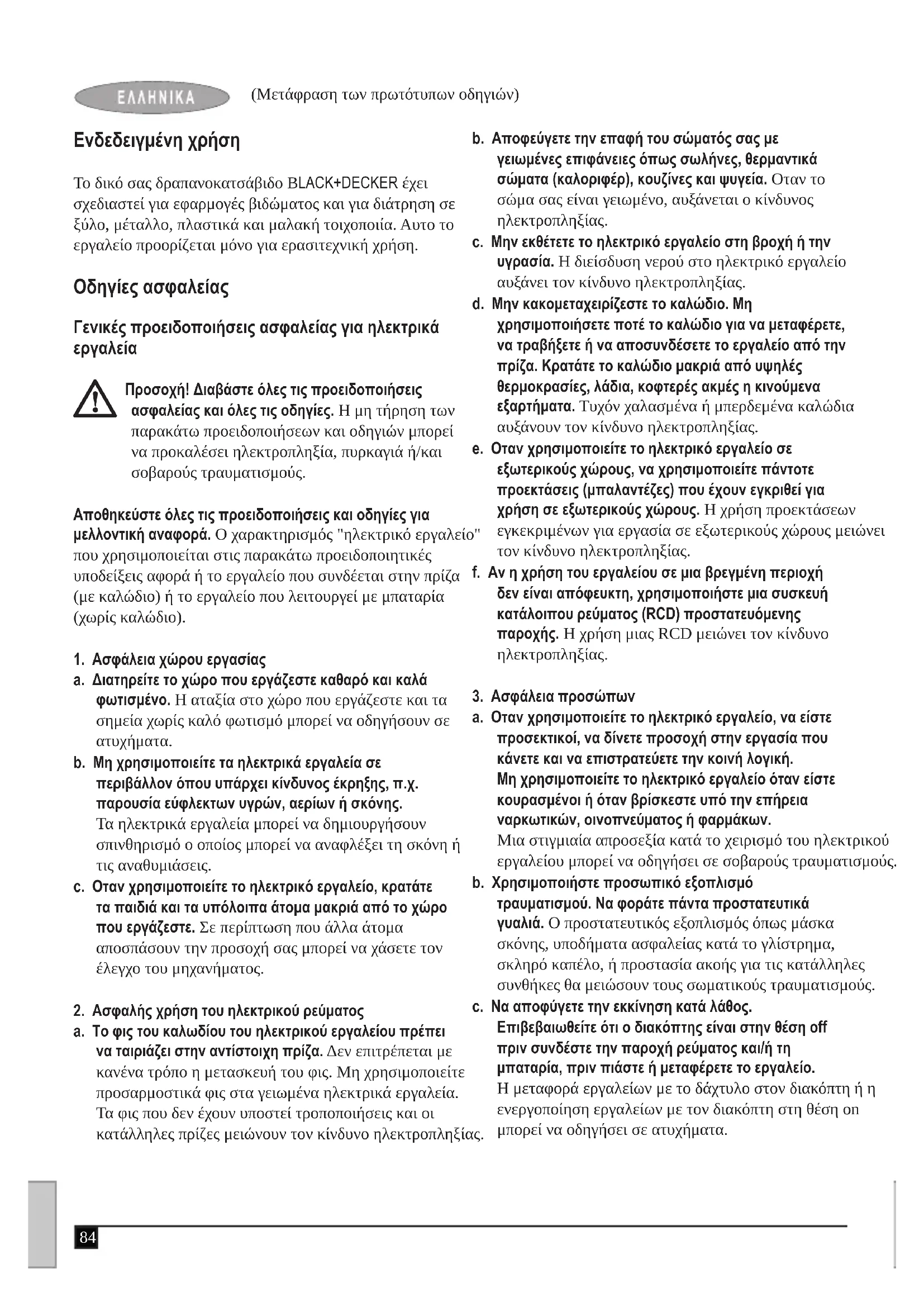 f. Av n xpnoi Tou epyaleiou o iia ppeyevn Tepioxn dev iivai aTROEuktn, xpoioutoInote ia oukeun kataoitou pemuatoc (RCD) npoataeouoevns npoxnc. H xpnoi uac RCD uovtov kivduvo nektponlaqic.