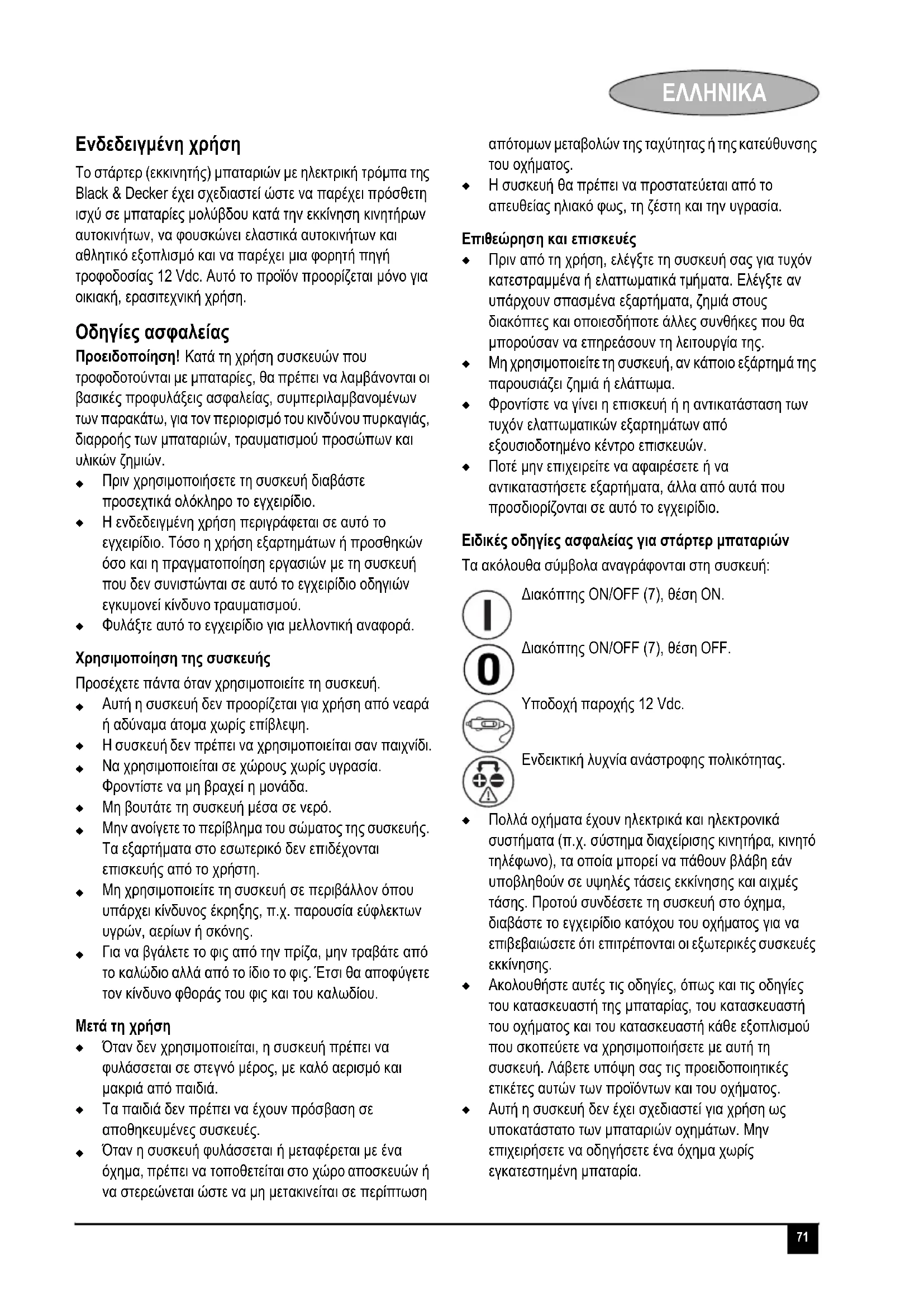 Ενδεδειγμένη χρήση Το στάρτερ (εκκινητής) μπαταριών με ηλεκτρική τρόμπα της Black & Decker έχει σχεδιαστεί ώστε να παρέχει πρόσθετη ισχύ σε μπαταρίες μολύβδου κατά την εκκίνηση κινητήρων αυτοκινήτων, να φουσκώνει ελαστικά αυτοκινήτων και αθλητικό εξοπλισμό και να παρέχει μια φορητή πηγή τροφοδοσίας 12 Vdc. Αυτό το προϊόν προορίζεται μόνο για οικιακή, ερασιτεχνική χρήση. Οδηγίες ασφαλείας Προειδοποίηση! Κατά τη χρήση συσκευών που τροφοδοτούνται με μπαταρίες, θα πρέπει να λαμβάνονται οι βασικές προφυλάξεις ασφαλείας, συμπεριλαμβανομένων των παρακάτω, για τον περιορισμό του κινδύνου πυρκαγιάς, διαρροής των μπαταριών, τραυματισμού προσώπων και υλικών ζημιών.