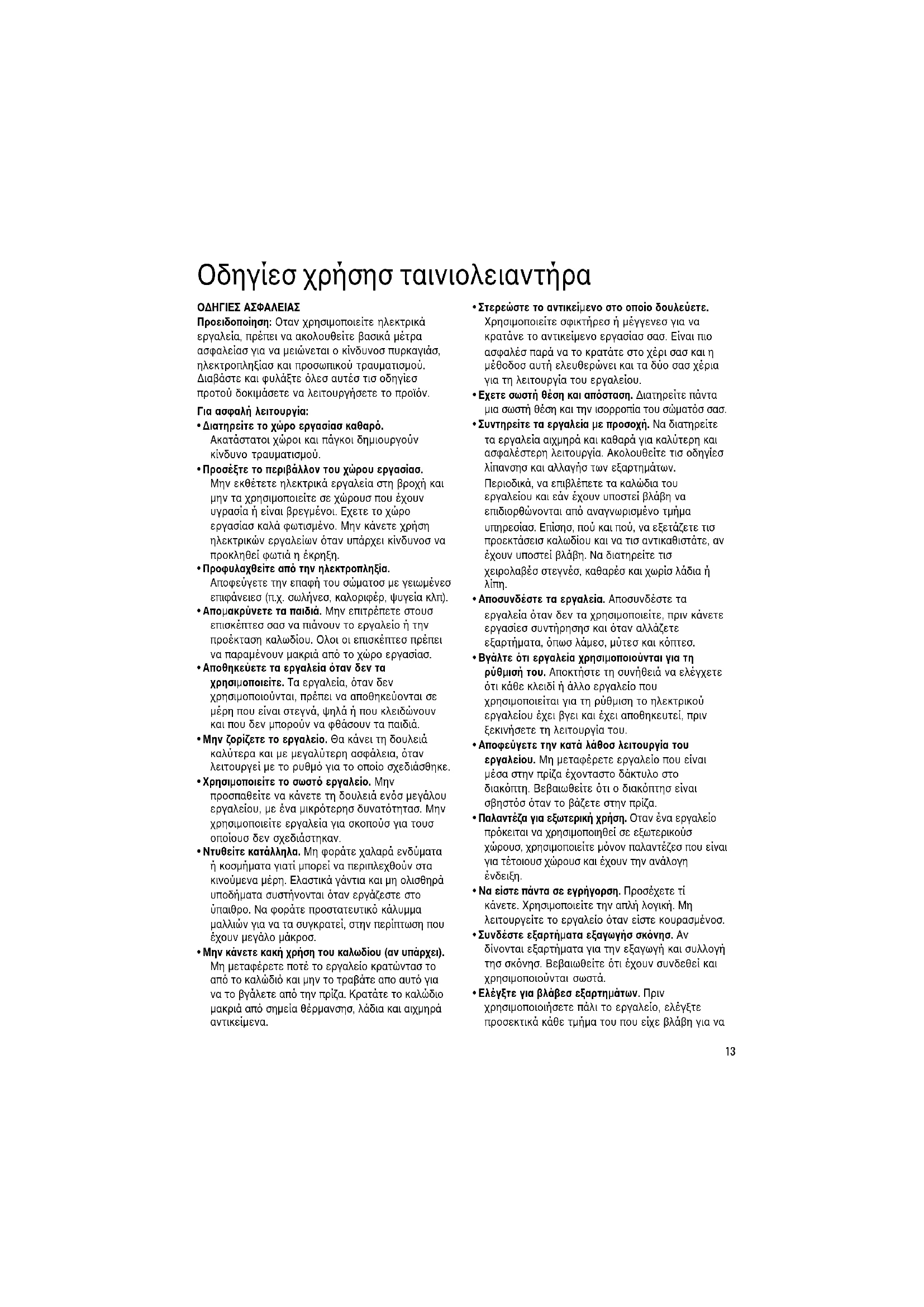 Προειδοποίηση: Oταν χρησιµοποιείτε ηλεκτρικά εργαλεία, πρέπει να ακολουθείτε βασικά µέτρα ασφαλείασ για να µειώνεται ο κίνδυνοσ πυρκαγιάσ, ηλεκτροπληξίασ και προσωπικού τραυµατισµού. ∆ιαβάστε και φυλάξτε λεσ αυτέσ τισ οδηγίεσ προτού δοκιµάσετε να λειτουργήσετε το προϊν. Για ασφαλή λειτουργία: