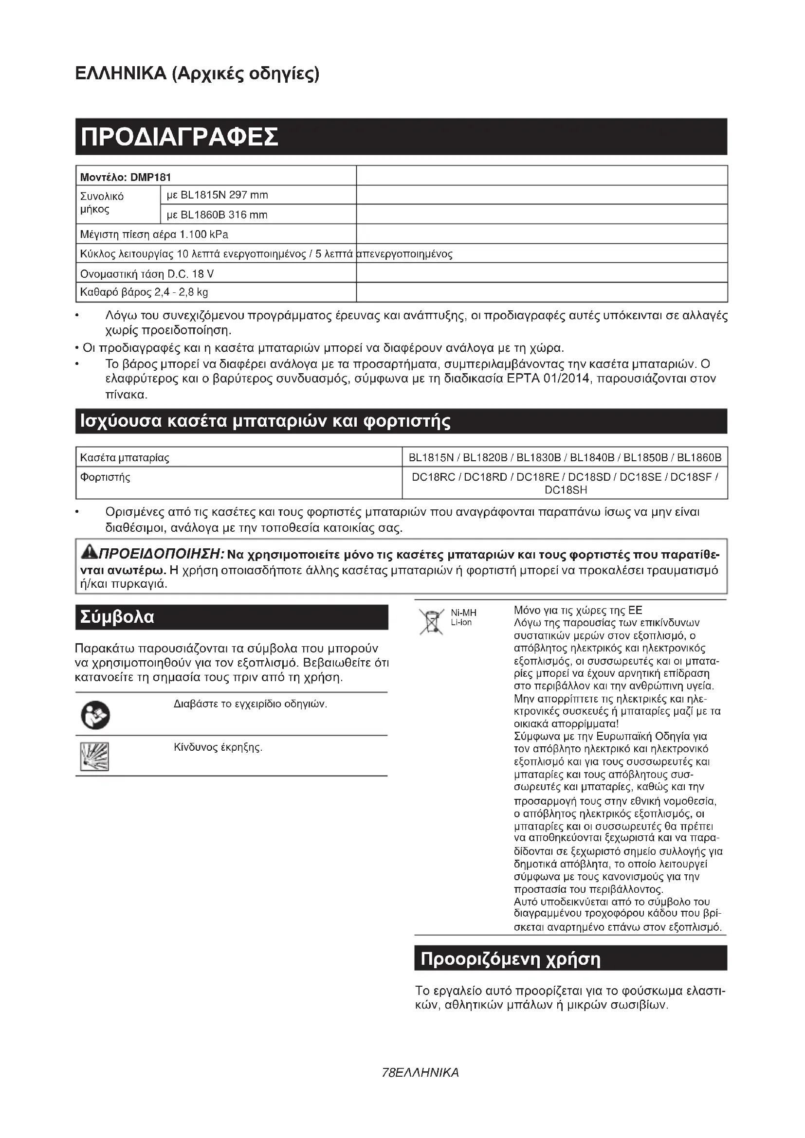 με BL1815N 297 mm με BL1860B 316 mm Μέγιστη πίεση αέρα 1.100 kPa Κύκλος λειτουργίας 10 λεπτά ενεργοποιημένος / 5 λεπτά απενεργοποιημένος Ονομαστική τάση D.C. 18 V Καθαρό βάρος 2,4 - 2,8 kg