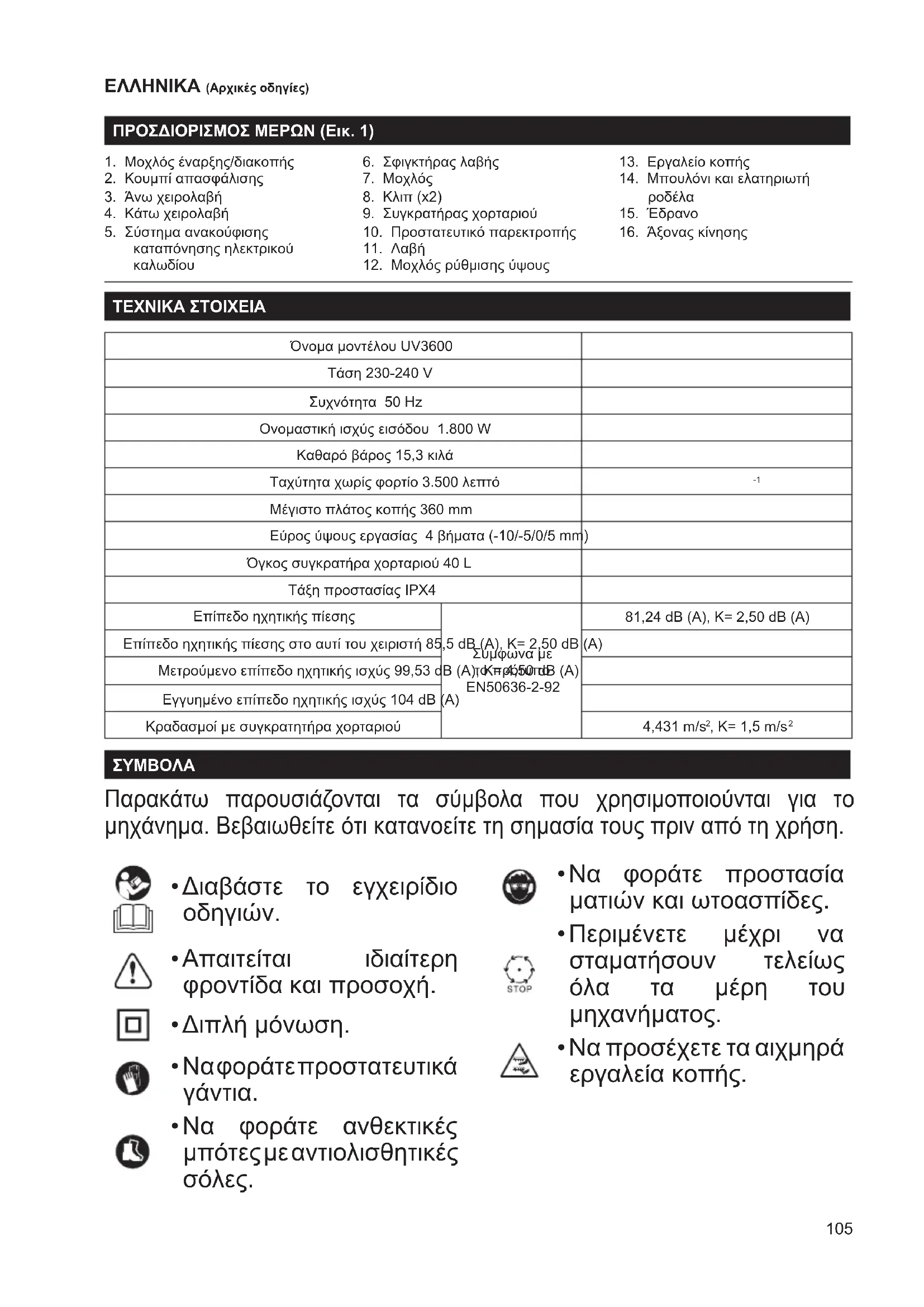ΤΕΧΝΙΚΑ ΣΤΟΙΧΕΙΑ Όνομα μοντέλου UV3600 Τάση 230-240 V Συχνότητα 50 Hz Ονομαστική ισχύς εισόδου 1.800 W Καθαρό βάρος 15,3 κιλά Ταχύτητα χωρίς φορτίο 3.500 λεπτό