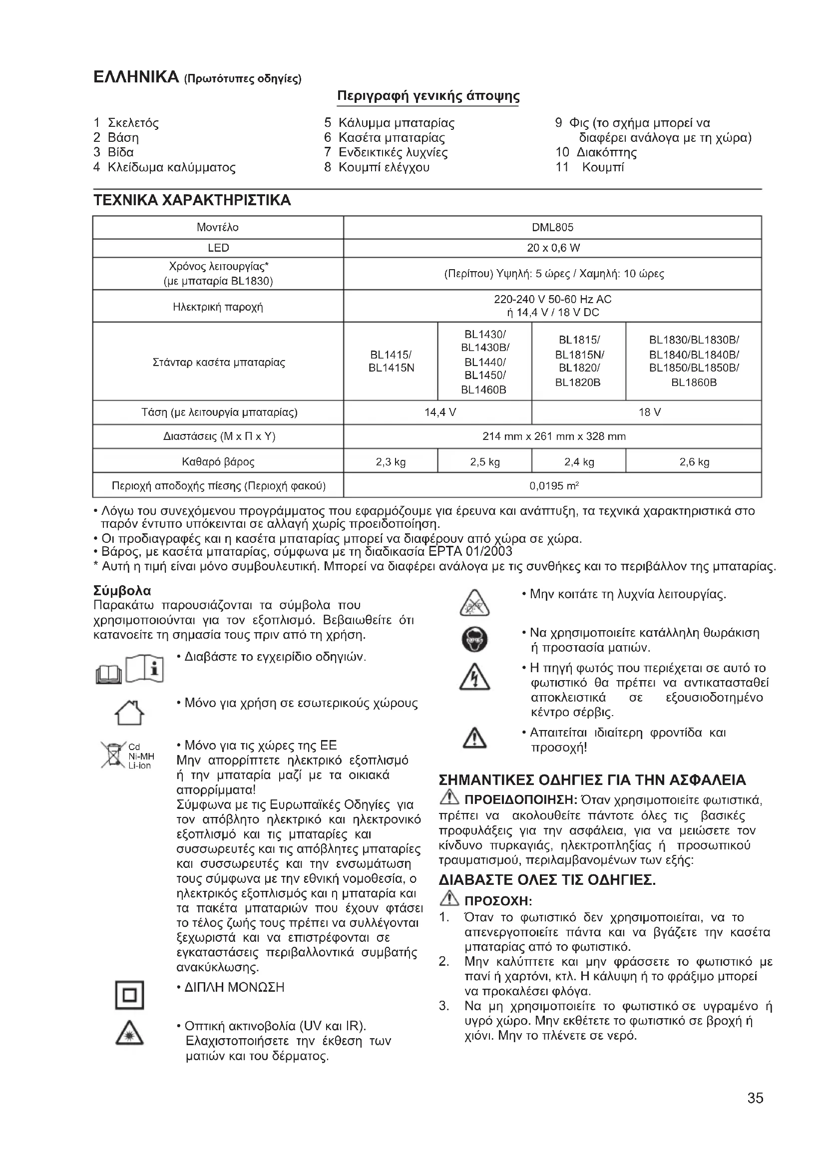 υγρό χώρο. Μην εκθέτετε το φωτιστικό σε βροχή ή χιόνι. Μην το πλένετε σε νερό. Μοντέλο DML805 LED 20 x 0,6 W Χρόνος λειτουργίας* (με μπαταρία BL1830) (Περίπου) Υψηλή: 5 ώρες / Χαμηλή: 10 ώρες Ηλεκτρική παροχή 220-240 V 50-60 Hz AC ή 14,4 V / 18 V DC Στάνταρ κασέτα μπαταρίας BL1415/ BL1415N BL1430/ BL1430B/ BL1440/ BL1450/ BL1460B BL1815/ BL1815N/ BL1820/ BL1820B BL1830/BL1830B/ BL1840/BL1840B/ BL1850/BL1850B/ BL1860B Τάση (με λειτουργία μπαταρίας) 14,4 V 18 V Διαστάσεις (Μ x Π x Υ) 214 mm x 261 mm x 328 mm Καθαρό βάρος 2,3 kg 2,5 kg 2,4 kg 2,6 kg Περιοχή αποδοχής πίεσης (Περιοχή φακού) 0,0195 m