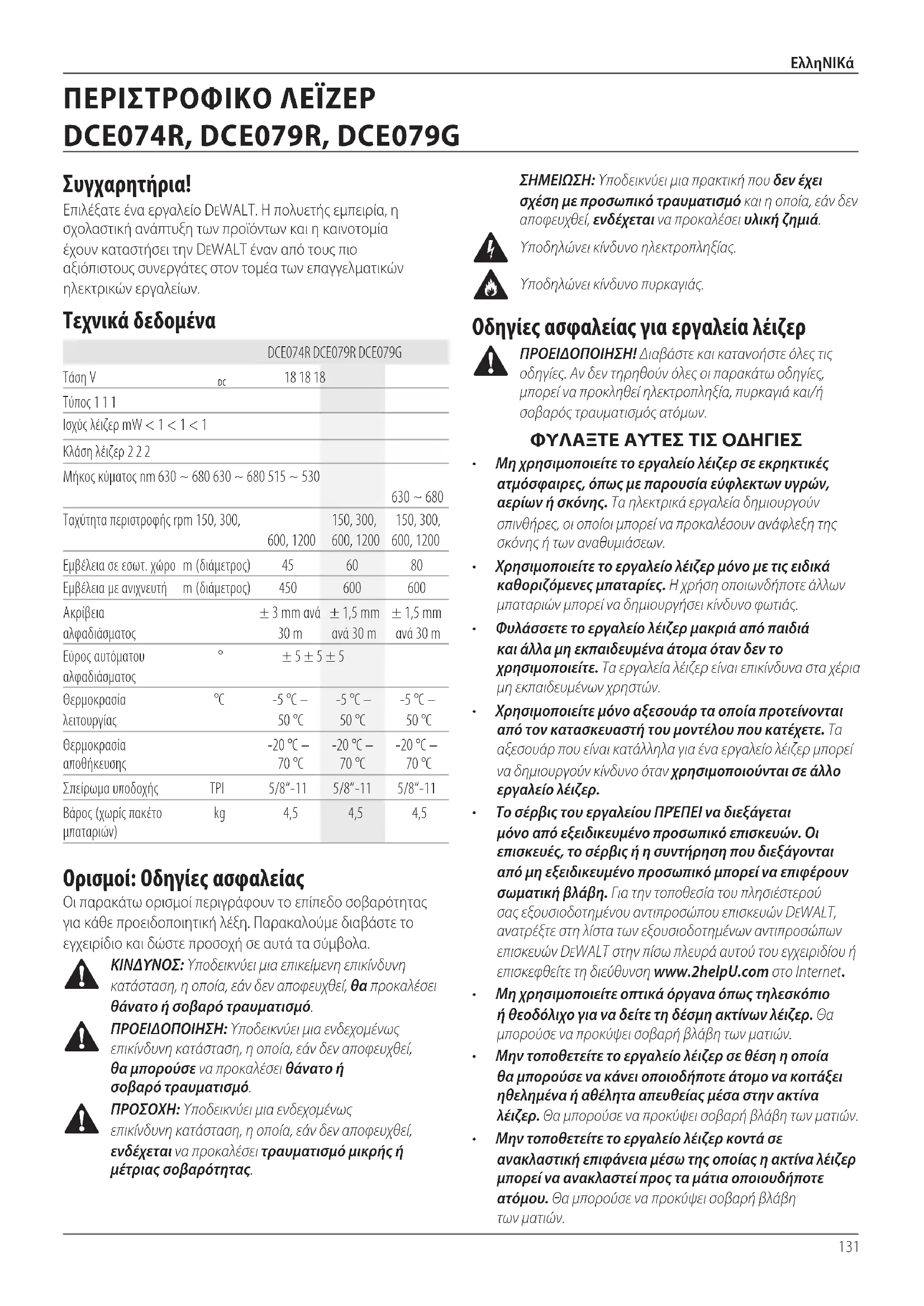 Κουμπί κάτω/δεξιόστροφης κατεύθυνσης Προβλεπομενη χρηση Το περιστροφικό λέιζερ DCE074R/DCE079R/DCE079G έχει σχεδιαστεί για την προβολή βοηθητικών γραμμών λέιζερ για επαγγελματικές εφαρμογές. Το εργαλείο μπορεί να χρησιμοποιηθεί τόσο σε εσωτερικούς όσο και εξωτερικούς χώρους για οριζόντια (στάθμη) και κατακόρυφη (αλφάδι) ευθυγράμμιση. Το εργαλείο μπορεί επίσης να δημιουργήσει μια σταθερή κουκίδα λέιζερ που μπορεί να κατευθυνθεί χειροκίνητα για την τοποθέτηση ή τη μεταφορά μιας ένδειξης. Οι εφαρμογές ποικίλουν από την τοποθέτηση ψευδοροφών και τη διαρρύθμιση τοίχων έως την ευθυγράμμιση θεμελιώσεων και τη δημιουργία εξέδρων. ΜΗΝ το χρησιμοποιείτε υπό υγρές συνθήκες ή με την παρουσία εύφλεκτων υγρών ήαερίων. Το λέιζερ αυτό είναι ένα επαγγελματικό εργαλείο. ΜΗΝ αφήνετε παιδιά να έρθουν σε επαφή με το εργαλείο. Απαιτείται επίβλεψη όταν το εργαλείο το χρησιμοποιούν άπειροι χρήστες. - Το προϊόν αυτό δεν προορίζεται για χρήση από άτομα (περιλαμβανομένων παιδιών) που έχουν μειωμένες σωματικές, αισθητηριακές ή πνευματικές ικανότητες, ή έλλειψη εμπειρίας και/ή γνώσης και δεξιοτήτων, εκτός αν τα άτομα αυτά επιβλέπονται από άτομο υπεύθυνο για την ασφάλειά τους. Τα παιδιά δεν πρέπει να μένουν ποτέ μόνα τους με αυτό τοπροϊόν. ΣΥΝΑΡΜΟΛΟΓΗΣΗ ΚΑΙ ΡΥΘΜΙΣΗ