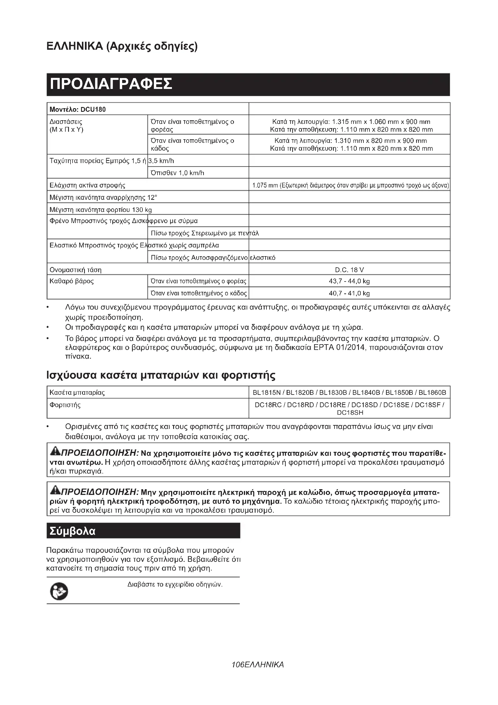 Μέγιστη ικανότητα αναρρίχησης 12° Μέγιστη ικανότητα φορτίου 130 kg Φρένο Μπροστινός τροχός Δισκόφρενο με σύρμα Πίσω τροχός Στερεωμένο με πεντάλ Ελαστικό Μπροστινός τροχός Ελαστικό χωρίς σαμπρέλα Πίσω τροχός Αυτοσφραγιζόμενο ελαστικό Ονομαστική τάση D.C. 18 V Καθαρό βάρος Όταν είναι τοποθετημένος ο φορέας 43,7 - 44,0 kg Όταν είναι τοποθετημένος ο κάδος 40,7 - 41,0 kg