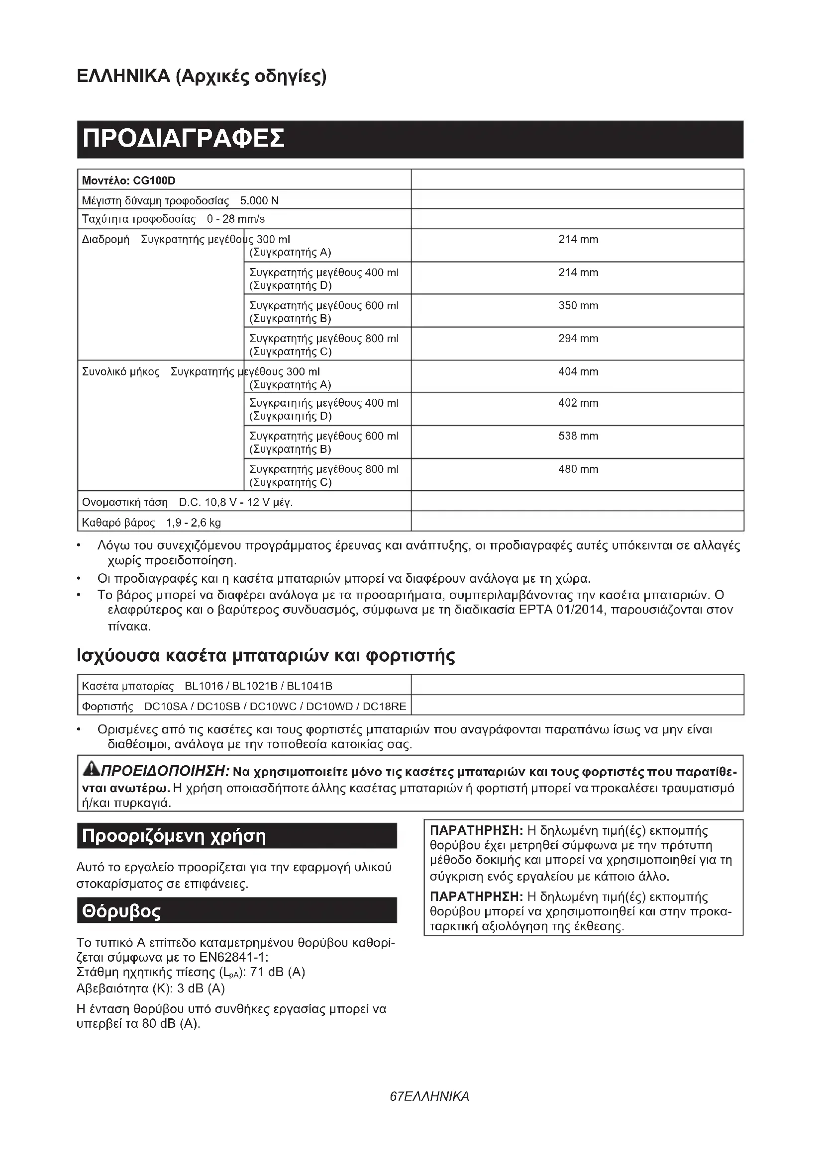 - Original Makita-akku og oplader BEMÆRK:Nogletingpådennelistekanværeinklu- deretiværktøjspakkensomstandardtilbehør.Detkan være forskellige fra land til land.67 ΕΛΛΗΝΙΚΑ ΕΛΛΗΝΙΚΑ (Αρχικές οδηγίες) ΠΡΟΔΙΑΓΡΑΦΕΣ Μοντέλο: CG100D Μέγιστηδύναμητροφοδοσίας 5.000 N Ταχύτητατροφοδοσίας 0 - 28 mm/s Διαδρομή Συγκρατητήςμεγέθους300ml (ΣυγκρατητήςA) 214 mm Συγκρατητήςμεγέθους400ml (ΣυγκρατητήςD) 214 mm Συγκρατητήςμεγέθους600ml (ΣυγκρατητήςB) 350 mm Συγκρατητήςμεγέθους800ml (ΣυγκρατητήςC) 294 mm Συνολικόμήκος Συγκρατητήςμεγέθους300ml (ΣυγκρατητήςA) 404 mm Συγκρατητήςμεγέθους400ml (ΣυγκρατητήςD) 402 mm Συγκρατητήςμεγέθους600ml (ΣυγκρατητήςB) 538 mm Συγκρατητήςμεγέθους800ml (ΣυγκρατητήςC) 480 mm Ονομαστικήτάση D.C.10,8V-12Vμέγ. Καθαρόβάρος 1,9 - 2,6 kg