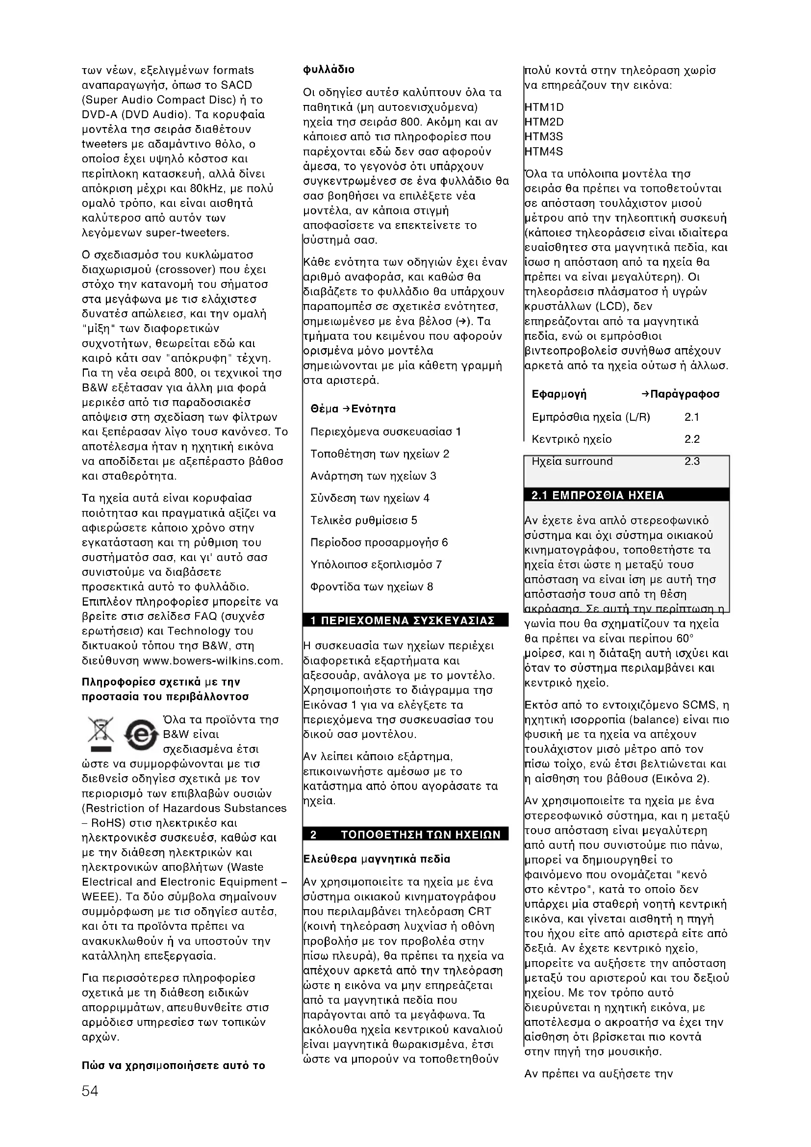 ια τη νέα σειρά 800, οι τεχνικοί τησ B&W εξέτασαν για άλλη µια φορά µερικέσ απ τισ παραδοσιακέσ απψεισ στη σχεδίαση των φίλτρων και ξεπέρασαν λίγο τουσ καννεσ. Το αποτέλεσµα ήταν η ηχητική εικνα να αποδίδεται µε αξεπέραστο βάθοσ και σταθερτητα. Τα ηχεία αυτά είναι κορυφαίασ ποιτητασ και πραγµατικά αξίζει να αφιερώσετε κάποιο χρνο στην εγκατάσταση και τη ρύθµιση του συστήµατσ σασ, και γι' αυτ σασ συνιστούµε να διαβάσετε προσεκτικά αυτ το φυλλάδιο. Επιπλέον πληροφορίεσ µπορείτε να βρείτε στισ σελίδεσ FAQ (συχνέσ ερωτήσεισ) και Technology του δικτυακού τπου τησ B&W, στη διεύθυνση www.bowers-wilkins.com. Πληροφορίεσ σχετικά µε την προστασία του περιβάλλοντοσ λα τα προϊντα τησ B&W είναι σχεδιασµένα έτσι ώστε να συµµορφώνονται µε τισ διεθνείσ οδηγίεσ σχετικά µε τον περιορισµ των επιβλαβών ουσιών (Restriction of Hazardous Substances – RoHS) στισ ηλεκτρικέσ και ηλεκτρονικέσ συσκευέσ, καθώσ και µε την διάθεση ηλεκτρικών και ηλεκτρονικών αποβλήτων (Waste Electrical and Electronic Equipment – WEEE). Τα δύο σύµβολα σηµαίνουν συµµρφωση µε τισ οδηγίεσ αυτέσ, και τι τα προϊντα πρέπει να ανακυκλωθούν ή να υποστούν την κατάλληλη επεξεργασία. Για περισστερεσ πληροφορίεσ σχετικά µε τη διάθεση ειδικών απορριµµάτων, απευθυνθείτε στισ αρµδιεσ υπηρεσίεσ των τοπικών