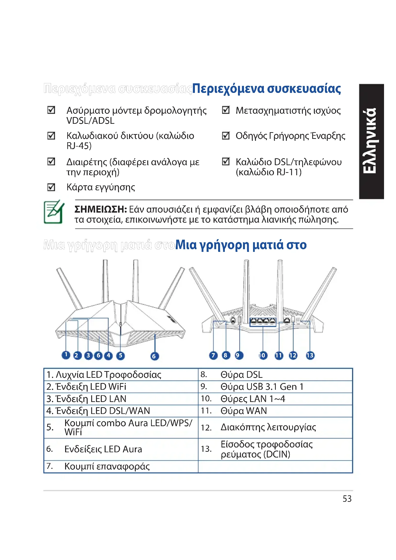 Μια γρήγορη ματιά στοΜια γρήγορη ματιά στο ΣΗΜΕΙΩΣΗ: Εάν απουσιάζει ή εμφανίζει βλάβη οποιοδήποτε από τα στοιχεία, επικοινωνήστε με το κατάστημα λιανικής πώλησης. Περιεχόμενα συσκευασίαςΠεριεχόμενα συσκευασίας Ασύρματο μόντεμ δρομολογητής VDSL/ADSL Μετασχηματιστής ισχύος Καλωδιακού δικτύου (καλώδιο RJ-45) Οδηγός Γρήγορης Έναρξης Διαιρέτης (διαφέρει ανάλογα με την περιοχή) Καλώδιο DSL/τηλεφώνου (καλώδιο RJ-11) Κάρτα εγγύησης