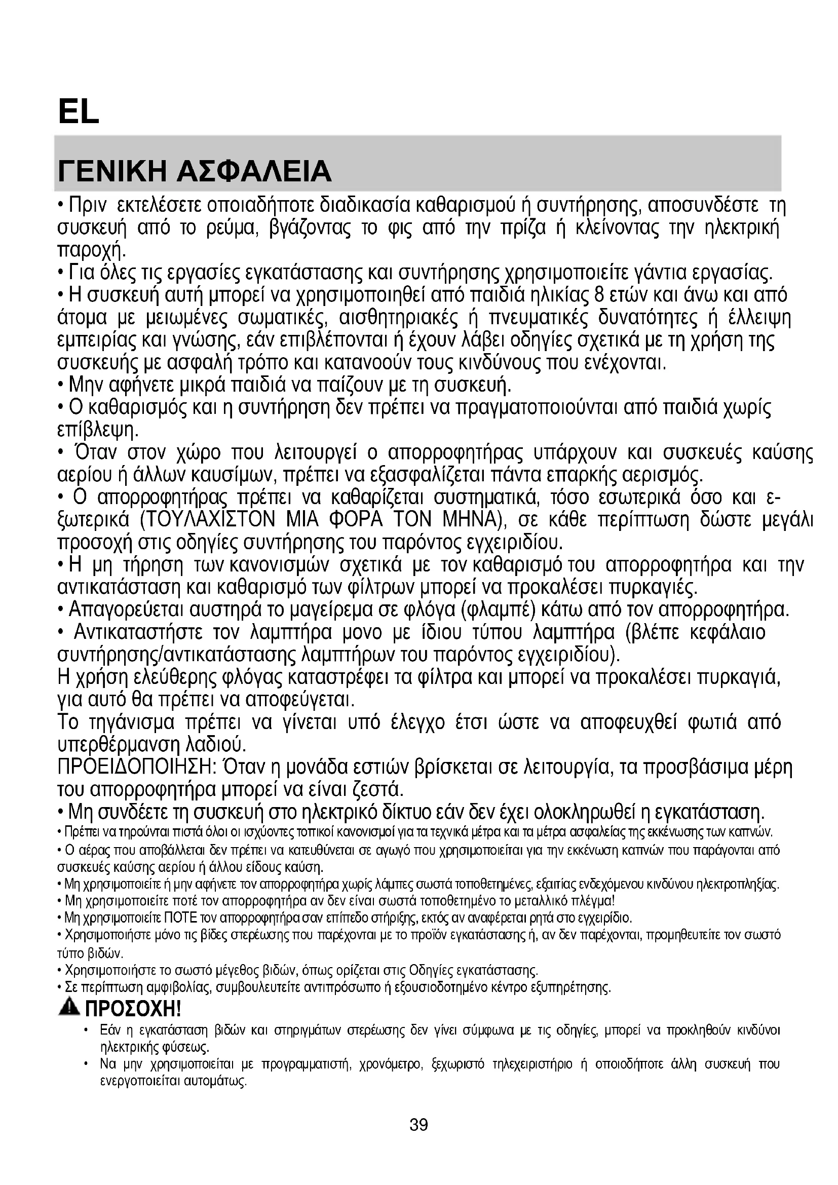 - Να μην χρησιμοποιείται με προγραμματιστή, χρονόμετρο, ξεχωριστό τηλεχειριστήριο ή οποιοδήποτε άλλη συσκευή που ενεργοποιείται αυτομάτως.40 Φυλάξτε τα παιδιά κάτω των 3 ετών μακριά από τη συσκευή. Σε περίπτωση που δεν υπάρχει συνεχής επίβλεψη ενός ενήλικα, φυλάξτε τη συσκευή μακριά από παιδιά κάτω των 8 ετών. ΠΡΟΣΟΧΗ: η συσκευή δεν προορίζεται για λειτουργία μέσω εξωτερικής διάταξης ή ξεχωριστού συστήματος απομακρυσμένου ελέγχου. Η παρούσα συσκευή δεν προορίζεται για επαγγελματική χρήση. Μην χρησιμοποιείτε τη συσκευή σε εξωτερικούς χώρους. Για την αποφυγή του κινδύνου ατομικών τραυματισμών, η συσκευή πρέπει να μεταφέρεται και να εγκαθίσταται από δύο ή περισσότερα