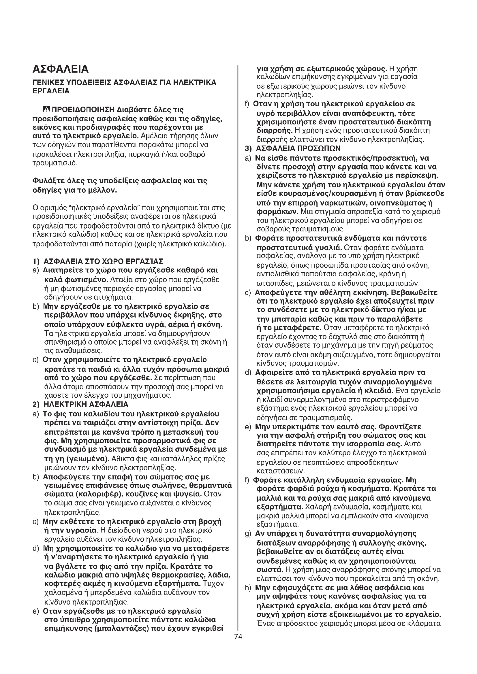 - ΠΡΟΕΙΔΟΠΟΙΗΣΗ Διαβάστε όλες τις προειδοποιήσεις ασφαλείας καθώς και τις οδηγίες, εικόνες και προδιαγραφές που παρέχονται με αυτό το ηλεκτρικό εργαλείο. Αμέλεια τήρησης όλων των οδηγιών που παρατίθενται παρακάτω μπορεί να προκαλέσει ηλεκτροπληξία, πυρκαγιά ή/και σοβαρό τραυματισμό. Φυλάξτε όλες τις υποδείξεις ασφαλείας και τις οδηγίες για το μέλλον. Ο ορισμός “ηλεκτρικό εργαλείο” που χρησιμοποιείται στις προειδοποιητικές υποδείξεις αναφέρεται σε ηλεκτρικά εργαλεία που τροφοδοτούνται από το ηλεκτρικό δίκτυο (με ηλεκτρικό καλώδιο) καθώς και σε ηλεκτρικά εργαλεία που τροφοδοτούνται από παταρία (χωρίς ηλεκτρικό καλώδιο).