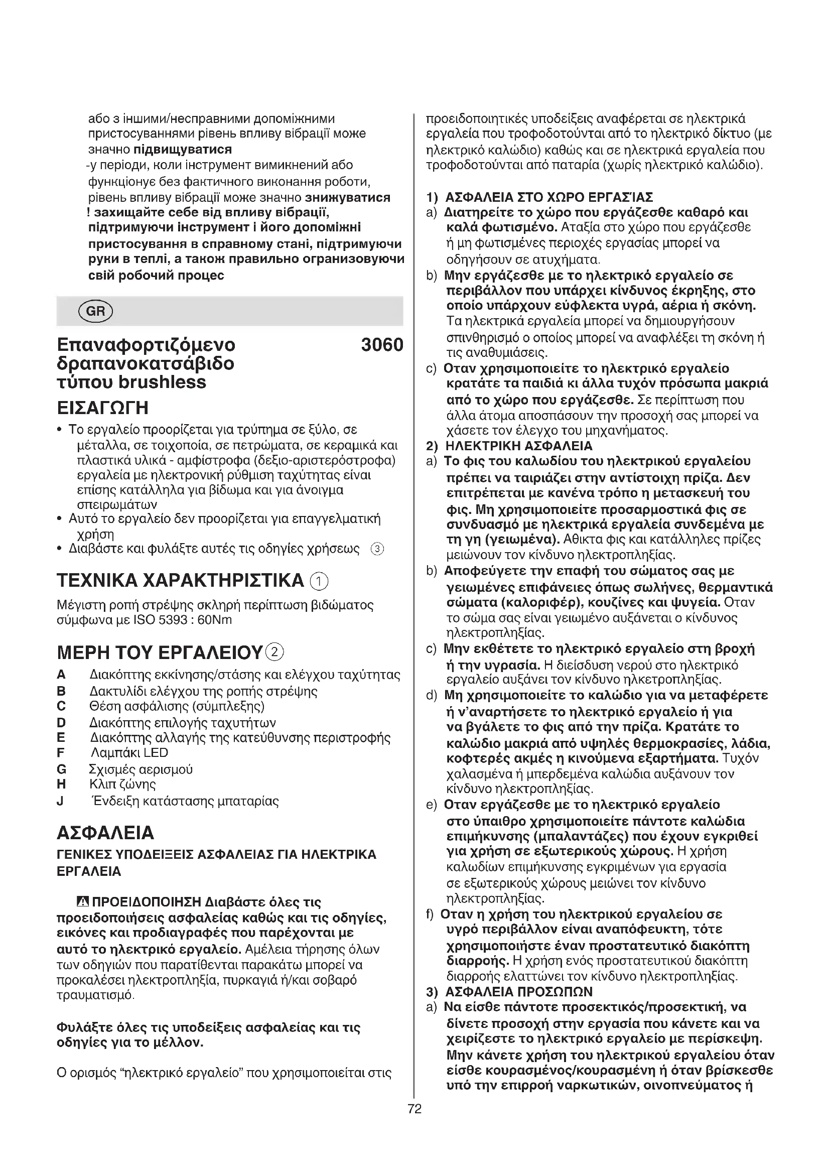 - Для оптимального вгвинчування необхідно створювати постійний тиск на інструмент, коли72 προειδοποιητικές υποδείξεις αναφέρεται σε ηλεκτρικά εργαλεία που τροφοδοτούνται από το ηλεκτρικό δίκτυο (με ηλεκτρικό καλώδιο) καθώς και σε ηλεκτρικά εργαλεία που τροφοδοτούνται από παταρία (χωρίς ηλεκτρικό καλώδιο).