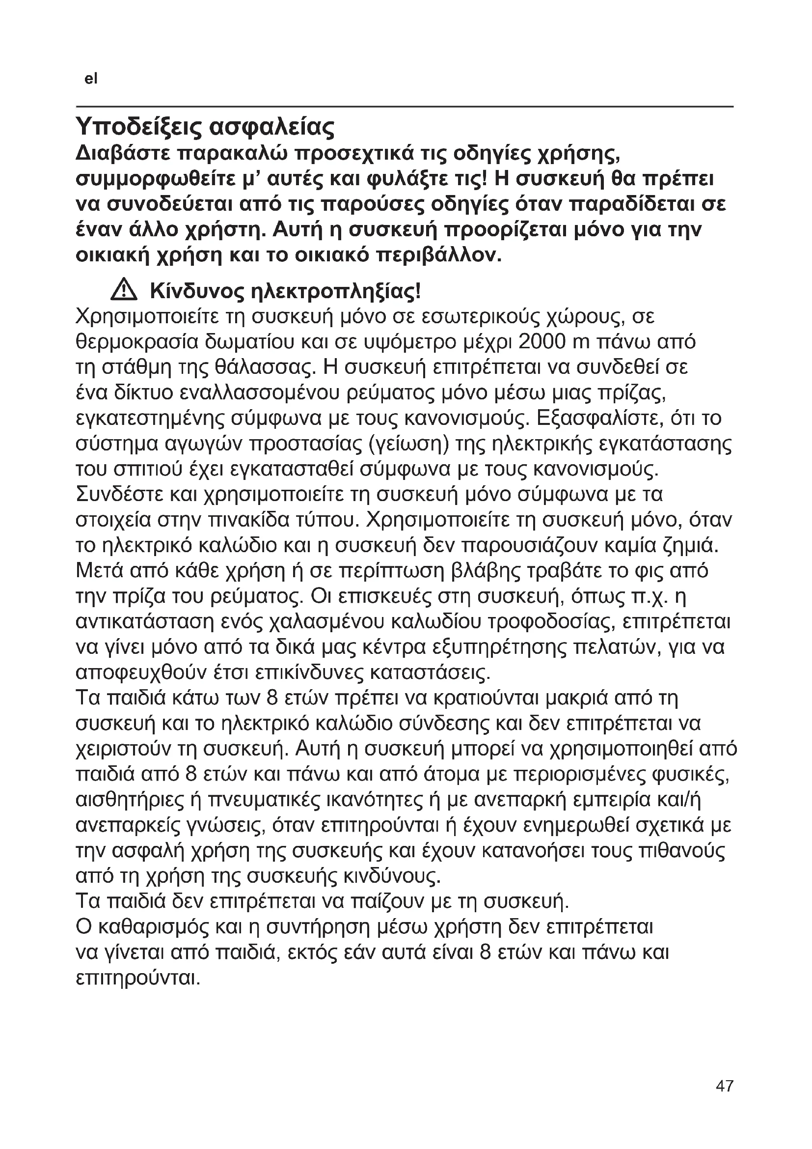 Υποδείξεις ασφαλείας Διαβάστε παρακαλώ προσεχτικά τις οδηγίες χρήσης, συμμορφωθείτε μ’ αυτές και φυλάξτε τις! Η συσκευή θα πρέπει να συνοδεύεται από τις παρούσες οδηγίες όταν παραδίδεται σε έναν άλλο χρήστη. Αυτή η συσκευή προορίζεται μόνο για την οικιακή χρήση και το οικιακό περιβάλλον. W Κίνδυνος ηλεκτροπληξίας! Χρησιμοποιείτε τη συσκευή μόνο σε εσωτερικούς χώρους, σε θερμοκρασία δωματίου και σε υψόμετρο μέχρι 2000 m πάνω από τη στάθμη της θάλασσας. Η συσκευή επιτρέπεται να συνδεθεί σε ένα δίκτυο εναλλασσομένου ρεύματος μόνο μέσω μιας πρίζας, εγκατεστημένης σύμφωνα με τους κανονισμούς. Εξασφαλίστε, ότι το σύστημα αγωγών προστασίας (γείωση) της ηλεκτρικής εγκατάστασης του σπιτιού έχει εγκατασταθεί σύμφωνα με τους κανονισμούς. Συνδέστε και χρησιμοποιείτε τη συσκευή μόνο σύμφωνα με τα στοιχεία στην πινακίδα τύπου. Χρησιμοποιείτε τη συσκευή μόνο, όταν το ηλεκτρικό καλώδιο και η συσκευή δεν παρουσιάζουν καμία ζημιά. Μετά από κάθε χρήση ή σε περίπτωση βλάβης τραβάτε το φις από την πρίζα του ρεύματος. Οι επισκευές στη συσκευή, όπως π.χ. η αντικατάσταση ενός χαλασμένου καλωδίου τροφοδοσίας, επιτρέπεται να γίνει μόνο από τα δικά μας κέντρα εξυπηρέτησης πελατών, για να αποφευχθούν έτσι επικίνδυνες καταστάσεις. Τα παιδιά κάτω των 8 ετών πρέπει να κρατιούνται μακριά από τη συσκευή και το ηλεκτρικό καλώδιο σύνδεσης και δεν επιτρέπεται να χειριστούν τη συσκευή. Αυτή η συσκευή μπορεί να χρησιμοποιηθεί από παιδιά από 8 ετών και πάνω και από άτομα με περιορισμένες φυσικές, αισθητήριες ή πνευματικές ικανότητες ή με ανεπαρκή εμπειρία και/ή ανεπαρκείς γνώσεις, όταν επιτηρούνται ή έχουν ενημερωθεί σχετικά με την ασφαλή χρήση της συσκευής και έχουν κατανοήσει τους πιθανούς από τη χρήση της συσκευής κινδύνους. Τα παιδιά δεν επιτρέπεται να παίζουν με τη συσκευή. Ο καθαρισμός και η συντήρηση μέσω χρήστη δεν επιτρέπεται να γίνεται από παιδιά, εκτός εάν αυτά είναι 8 ετών και πάνω και επιτηρούνται.48