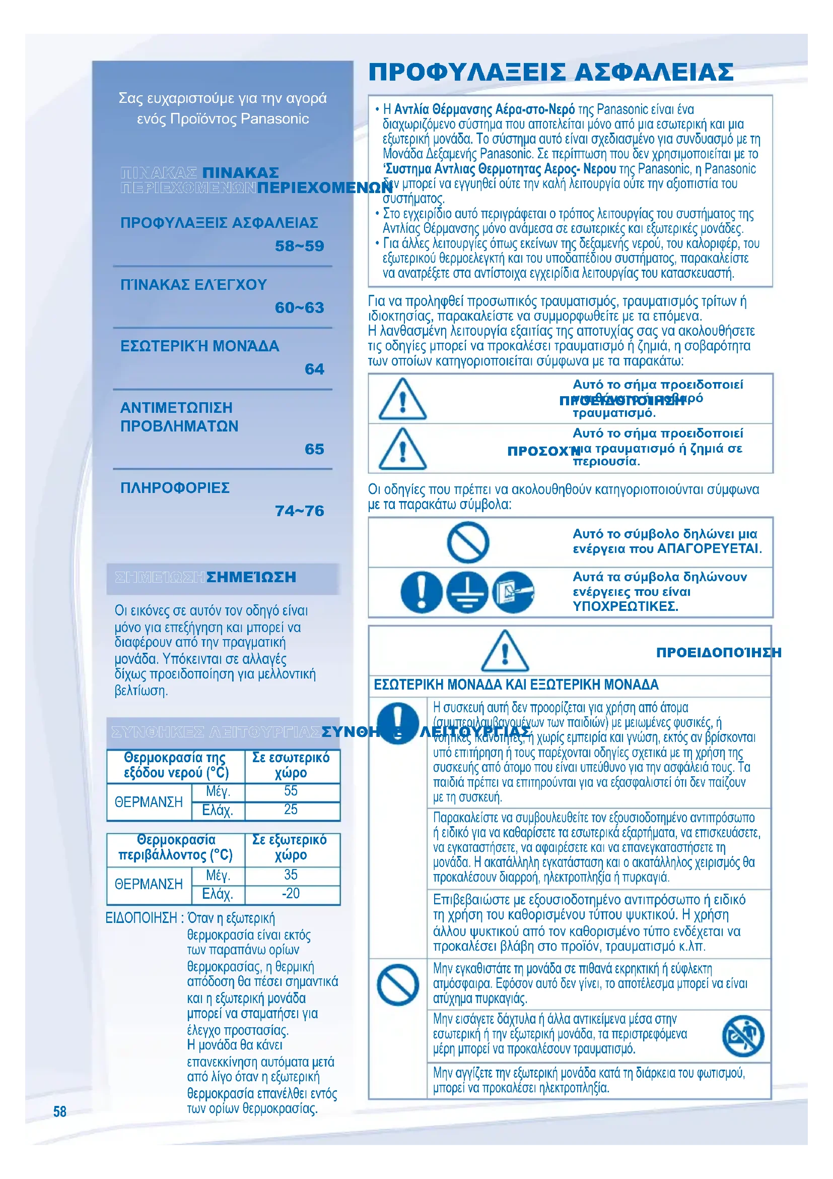 - Για άλλες λειτουργίες όπως εκείνων της δεξαμενής νερού, του καλοριφέρ, του εξωτερικού θερμοελεγκτή και του υποδαπέδιου συστήματος, παρακαλείστε να ανατρέξετε στα αντίστοιχα εγχειρίδια λειτουργίας του κατασκευαστή. ΠΡΟΦΥΛΑΞΕΙΣ ΑΣΦΑΛΕΙΑΣ Σας ευχαριστούμε για την αγορά ενός Προϊόντος Panasonic ΠΙΝΑΚΑΣ ΠΙΝΑΚΑΣ ΠΕΡΙΕΧΟΜΕΝΩΝΠΕΡΙΕΧΟΜΕΝΩΝ ΠΡΟΦΥΛΑΞΕΙΣ ΑΣΦΑΛΕΙΑΣ 58~59 ΠΊΝΑΚΑΣ ΕΛΈΓΧΟΥ 60~63 ΕΣΩΤΕΡΙΚΉ ΜΟΝΆΔΑ