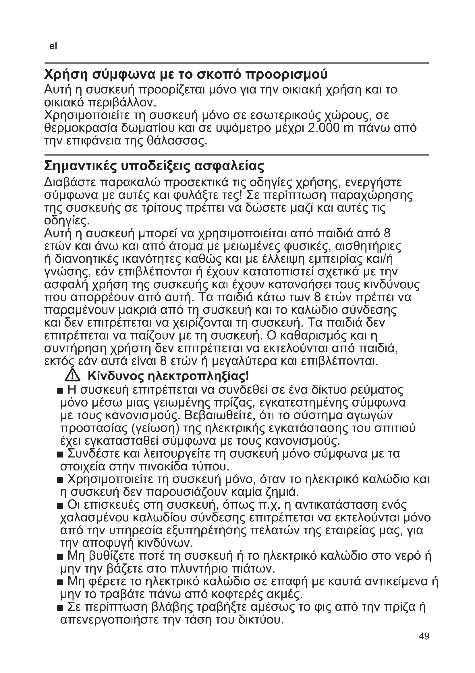 Αυτή η συσκευή μπορεί να χρησιμοποιείται από παιδιά από 8 ετών και άνω και από άτομα με μειωμένες φυσικές, αισθητήριες ή διανοητικές ικανότητες καθώς και με έλλειψη εμπειρίας και/ή γνώσης, εάν επιβλέπονται ή έχουν κατατοπιστεί σχετικά με την ασφαλή χρήση της συσκευής και έχουν κατανοήσει τους κινδύνους που απορρέουν από αυτή. Τα παιδιά κάτω των 8 ετών πρέπει να παραμένουν μακριά από τη συσκευή και το καλώδιο σύνδεσης και δεν επιτρέπεται να χειρίζονται τη συσκευή. Τα παιδιά δεν επιτρέπεται να παίζουν με τη συσκευή. Ο καθαρισμός και η συντήρηση χρήστη δεν επιτρέπεται να εκτελούνται από παιδιά, εκτός εάν αυτά είναι 8 ετών ή μεγαλύτερα και επιβλέπονται. W Κίνδυνος ηλεκτροπληξίας! ■ Η συσκευή επιτρέπεται να συνδεθεί σε ένα δίκτυο ρεύματος μόνο μέσω μιας γειωμένης πρίζας, εγκατεστημένης σύμφωνα με τους κανονισμούς. Βεβαιωθείτε, ότι το σύστημα αγωγών προστασίας (γείωση) της ηλεκτρικής εγκατάστασης του σπιτιού έχει εγκατασταθεί σύμφωνα με τους κανονισμούς. ■ Συνδέστε και λειτουργείτε τη συσκευή μόνο σύμφωνα με τα στοιχεία στην πινακίδα τύπου. ■ Χρησιμοποιείτε τη συσκευή μόνο, όταν το ηλεκτρικό καλώδιο και η συσκευή δεν παρουσιάζουν καμία ζημιά. ■ Οι επισκευές στη συσκευή, όπως π.χ. η αντικατάσταση ενός χαλασμένου καλωδίου σύνδεσης επιτρέπεται να εκτελούνται μόνο από την υπηρεσία εξυπηρέτησης πελατών της εταιρείας μας, για την αποφυγή κινδύνων. ■ Μη βυθίζετε ποτέ τη συσκευή ή το ηλεκτρικό καλώδιο στο νερό ή μην την βάζετε στο πλυντήριο πιάτων. ■ Μη φέρετε το ηλεκτρικό καλώδιο σε επαφή με καυτά αντικείμενα ή μην το τραβάτε πάνω από κοφτερές ακμές. ■ Σε περίπτωση βλάβης τραβήξτε αμέσως το φις από την πρίζα ή απενεργοποιήστε την τάση του δικτύου.50