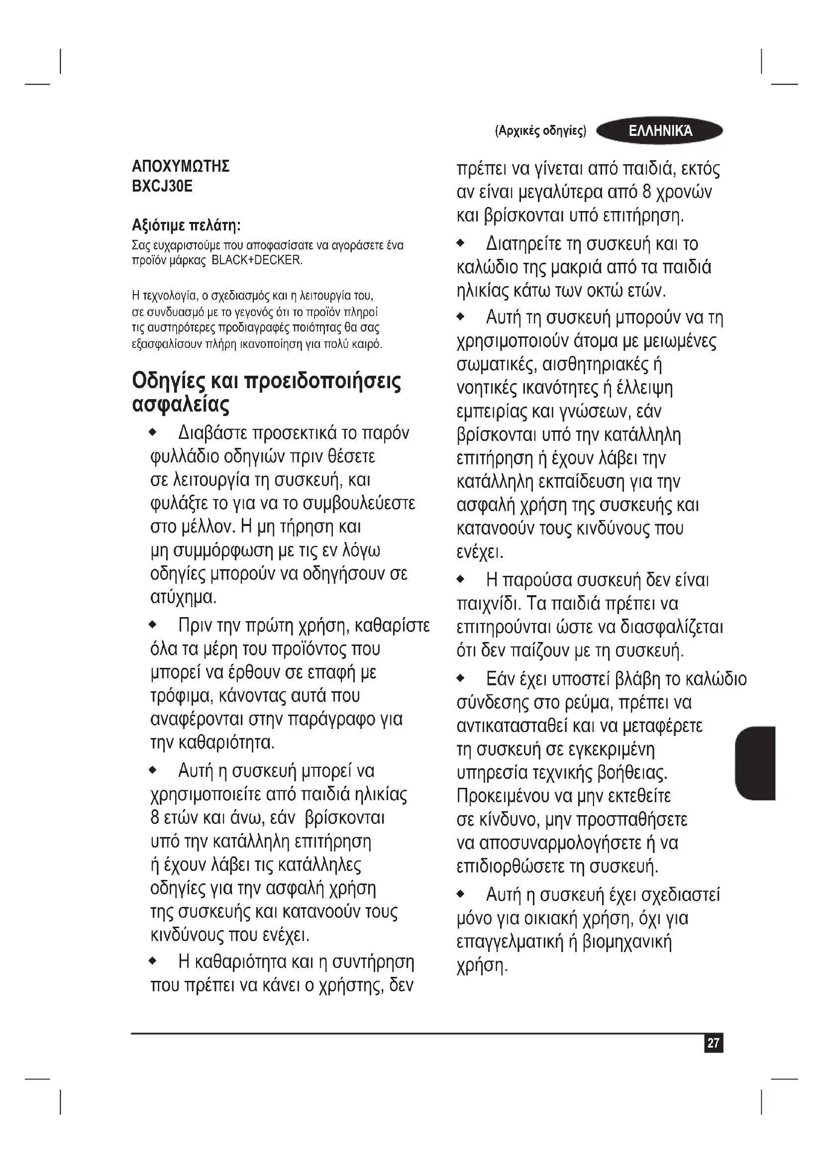 BXCJ30E Αξιότιμε πελάτη: Σας ευχαριστούμε που αποφασίσατε να αγοράσετε ένα προϊόν μάρκας BLACK+DECKER. Η τεχνολογία, ο σχεδιασμός και η λειτουργία του, σε συνδυασμό με το γεγονός ότι το προϊόν πληροί τις αυστηρότερες προδιαγραφές ποιότητας θα σας εξασφαλίσουν πλήρη ικανοποίηση για πολύ καιρό. Οδηγίες και προειδοποιήσεις