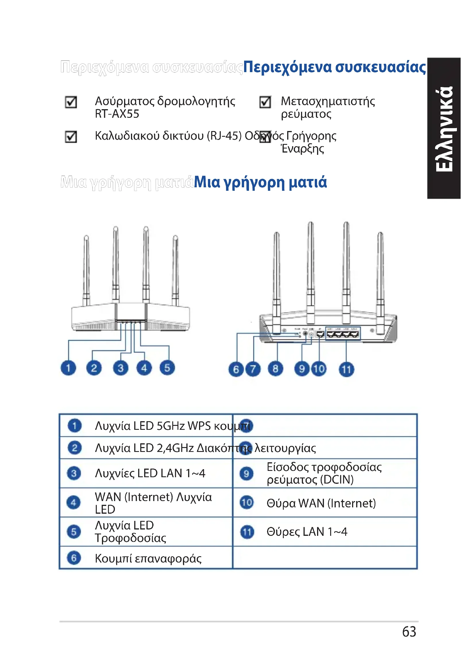 Μια γρήγορη ματιάΜια γρήγορη ματιά Περιεχόμενα συσκευασίαςΠεριεχόμενα συσκευασίας Ασύρματος δρομολογητής RT-AX55 Μετασχηματιστής