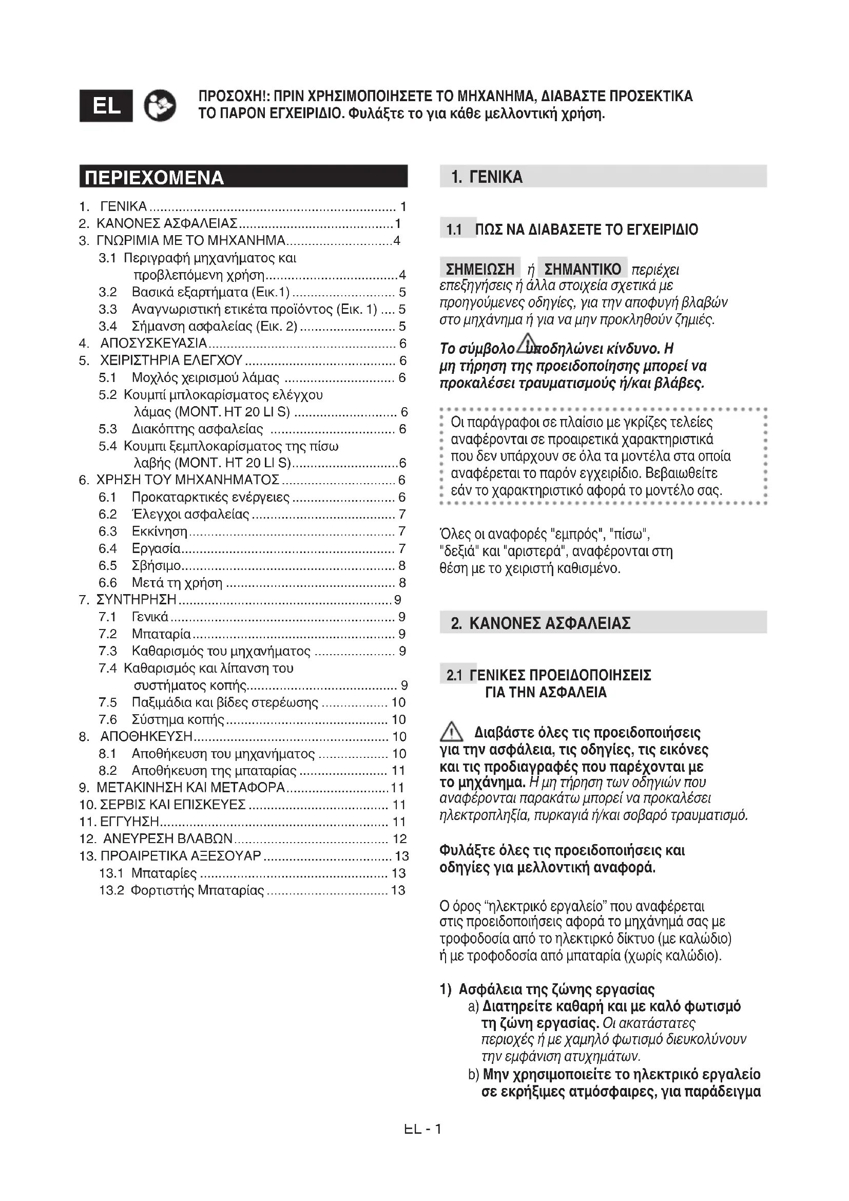 Vorrichtung, die man für das Auaden der Batterie verwendet (Abb.19).EL - 1 ΠΡΟΣΟΧΗ!: ΠΡΙΝ ΧΡΗΣΙΜΟΠΟΙΗΣΕΤΕ ΤΟ ΜΗΧΑΝΗΜΑ, ΔΙΑΒΑΣΤΕ ΠΡΟΣΕΚΤΙΚΑ ΤΟ ΠΑΡΟΝ ΕΓΧΕΙΡΙΔΙΟ. Φυλάξτε το για κάθε μελλοντική χρήση.