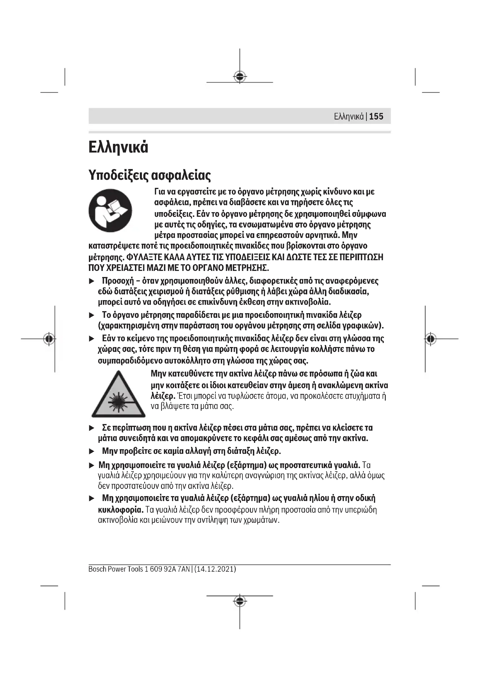 Υποδείξεις ασφαλείας Για να εργαστείτε με το όργανο μέτρησης χωρίς κίνδυνο και με ασφάλεια, πρέπει να διαβάσετε και να τηρήσετε όλες τις υποδείξεις. Εάν το όργανο μέτρησης δε χρησιμοποιηθεί σύμφωνα με αυτές τις οδηγίες, τα ενσωματωμένα στο όργανο μέτρησης μέτρα προστασίας μπορεί να επηρεαστούν αρνητικά. Μην καταστρέψετε ποτέ τις προειδοποιητικές πινακίδες που βρίσκονται στο όργανο μέτρησης. ΦΥΛΑΞΤΕ ΚΑΛΑ ΑΥΤΕΣ ΤΙΣ ΥΠΟΔΕΙΞΕΙΣ ΚΑΙ ΔΩΣΤΕ ΤΕΣ ΣΕ ΠΕΡΙΠΤΩΣΗ ΠΟΥ ΧΡΕΙΑΣΤΕΙ ΜΑΖΙ ΜΕ ΤΟ ΟΡΓΑΝΟ ΜΕΤΡΗΣΗΣ. u Προσοχή – όταν χρησιμοποιηθούν άλλες, διαφορετικές από τις αναφερόμενες εδώ διατάξεις χειρισμού ή διατάξεις ρύθμισης ή λάβει χώρα άλλη διαδικασία, μπορεί αυτό να οδηγήσει σε επικίνδυνη έκθεση στην ακτινοβολία. u Το όργανο μέτρησης παραδίδεται με μια προειδοποιητική πινακίδα λέιζερ (χαρακτηρισμένη στην παράσταση του οργάνου μέτρησης στη σελίδα γραφικών). u Εάν το κείμενο της προειδοποιητικής πινακίδας λέιζερ δεν είναι στη γλώσσα της χώρας σας, τότε πριν τη θέση για πρώτη φορά σε λειτουργία κολλήστε πάνω το συμπαραδιδόμενο αυτοκόλλητο στη γλώσσα της χώρας σας. Μην κατευθύνετε την ακτίνα λέιζερ πάνω σε πρόσωπα ή ζώα και μην κοιτάξετε οι ίδιοι κατευθείαν στην άμεση ή ανακλώμενη ακτίνα λέιζερ. Έτσι μπορεί να τυφλώσετε άτομα, να προκαλέσετε ατυχήματα ή να βλάψετε τα μάτια σας. u Σε περίπτωση που η ακτίνα λέιζερ πέσει στα μάτια σας, πρέπει να κλείσετε τα μάτια συνειδητά και να απομακρύνετε το κεφάλι σας αμέσως από την ακτίνα. u Μην προβείτε σε καμία αλλαγή στη διάταξη λέιζερ. u Μη χρησιμοποιείτε τα γυαλιά λέιζερ (εξάρτημα) ως προστατευτικά γυαλιά. Τα γυαλιά λέιζερ χρησιμεύουν για την καλύτερη αναγνώριση της ακτίνας λέιζερ, αλλά όμως δεν προστατεύουν από την ακτίνα λέιζερ. u Μη χρησιμοποιείτε τα γυαλιά λέιζερ (εξάρτημα) ως γυαλιά ηλίου ή στην οδική κυκλοφορία. Τα γυαλιά λέιζερ δεν προσφέρουν πλήρη προστασία από την υπεριώδη ακτινοβολία και μειώνουν την αντίληψη των χρωμάτων. Bosch Power Tools 1 609 92A 7AN | (14.12.2021)156 | Ελληνικά u Αναθέστε την επισκευή του οργάνου μέτρησης μόνο σε ειδικευμένο τεχνικό προσωπικό και μόνο με γνήσια ανταλλακτικά. Μ’ αυτόν τον τρόπο εξασφαλίζεται η διατήρηση της ασφαλούς λειτουργίας του εργαλείου μέτρησης. u Μην αφήσετε παιδιά χωρίς επιτήρηση να χρησιμοποιήσουν το όργανο μέτρησης λέιζερ. Θα μπορούσαν ακούσια να τυφλώσουν άλλα άτομα ή να τυφλωθούν τα ίδια. u Μην εργάζεστε με το όργανο μέτρησης σε επικίνδυνο για έκρηξη περιβάλλον, στο οποίο βρίσκονται εύφλεκτα υγρά, αέρια ή εύφλεκτες σκόνες. Στο εσωτερικό του εργαλείου μέτρησης μπορεί να δημιουργηθεί σπινθηρισμός κι έτσι να αναφλεχθούν η σκόνη ή οι αναθυμιάσεις. Μη φέρετε το όργανο μέτρησης και τα μαγνητικά εξαρτήματα κοντά σε εμφυτεύματα και άλλες ιατρικές συσκευές, όπως π.χ. βηματοδότης καρδιάς ή αντλία ινσουλίνης. Από τους μαγνήτες του οργάνου μέτρησης και των εξαρτημάτων δημιουργείται ένα πεδίο, το οποίο μπορεί να θέσει σε κίνδυνο τη λειτουργία των εμφυτευμάτων και των ιατρικών συσκευών. u Κρατάτε το όργανο μέτρησης και τα μαγνητικά εξαρτήματα μακριά από μαγνητικούς φορείς δεδομένων και μαγνητικές ευαίσθητες συσκευές. Από τη δράση των μαγνητών του οργάνου μέτρησης και των εξαρτημάτων μπορεί να προκληθούν μη αναστρέψιμες απώλειες δεδομένων. Περιγραφή προϊόντος και ισχύος Προσέξτε παρακαλώ τις εικόνες στο μπροστινό μέρος των οδηγιών λειτουργίας. Χρήση σύμφωνα με τον προο