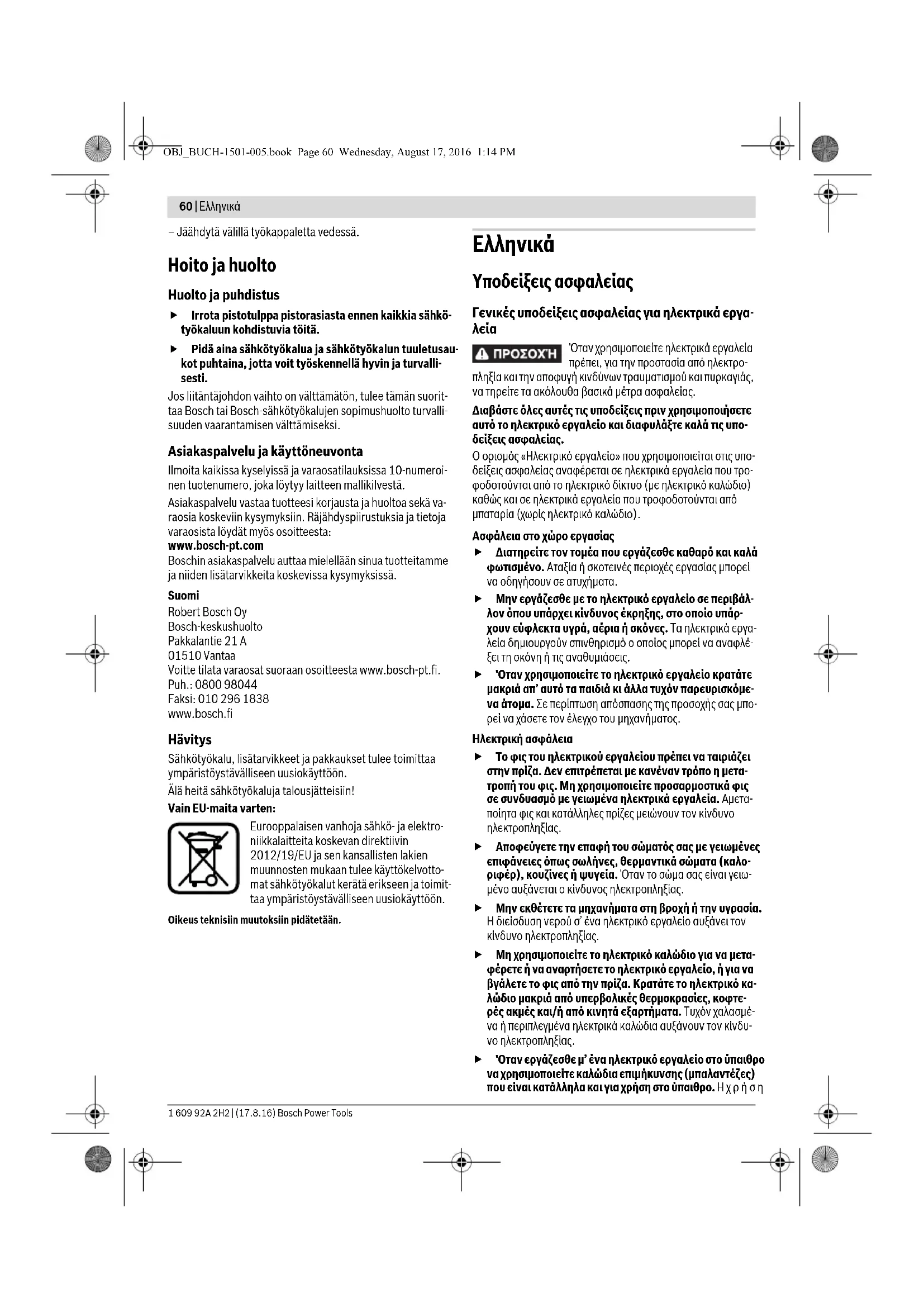 Όταν χρησιμοποιείτε ηλεκτρικά εργαλεία πρέπει, για την προστασία από ηλεκτρο- πληξία και την αποφυγή κινδύνων τραυματισμού και πυρκαγιάς, να τηρείτε τα ακόλουθα βασικά μέτρα ασφαλείας. Διαβάστε όλες αυτές τις υποδείξεις πριν χρησιμοποιήσετε αυτό το ηλεκτρικό εργαλείο και διαφυλάξτε καλά τις υπο- δείξεις ασφαλείας. Ο ορισμός «Ηλεκτρικό εργαλείο» που χρησιμοποιείται στις υπο- δείξεις ασφαλείας αναφέρεται σε ηλεκτρικά εργαλεία που τρο- φοδοτούνται από το ηλεκτρικό δίκτυο (με ηλεκτρικό καλώδιο) καθώς και σε ηλεκτρικά εργαλεία που τροφοδοτούνται από μπαταρία (χωρίς ηλεκτρικό καλώδιο). Ασφάλεια στο χώρο εργασίας Διατηρείτε τον τομέα που εργάζεσθε καθαρό και καλά φωτισμένο. Αταξία ή σκοτεινές περιοχές εργασίας μπορεί να οδηγήσουν σε ατυχήματα. Μην εργάζεσθε με το ηλεκτρικό εργαλείο σε περιβάλ- λον όπου υπάρχει κίνδυνος έκρηξης, στο οποίο υπάρ- χουν εύφλεκτα υγρά, αέρια ή σκόνες. Τα ηλεκτρικά εργα- λεία δημιουργούν σπινθηρισμό ο οποίος μπορεί να αναφλέ- ξει τη σκόνη ή τις αναθυμιάσεις. Όταν χρησιμοποιείτε το ηλεκτρικό εργαλείο κρατάτε μακριά απ’ αυτό τα παιδιά κι άλλα τυχόν παρευρισκόμε- να άτομα. Σε περίπτωση απόσπασης της προσοχής σας μπο- ρεί να χάσετε τον έλεγχο του μηχανήματος. Ηλεκτρική ασφάλεια Το φις του ηλεκτρικού εργαλείου πρέπει να ταιριάζει στην πρίζα. Δεν επιτρέπεται με κανέναν τρόπο η μετα- τροπή του φις. Μη χρησιμοποιείτε προσαρμοστικά φις σε συνδυασμό με γειωμένα ηλεκτρικά εργαλεία. Αμετα- ποίητα φις και κατάλληλες πρίζες μειώνουν τον κίνδυνο ηλεκτροπληξίας. Αποφεύγετε την επαφή του σώματός σας με γειωμένες επιφάνειες όπως σωλήνες, θερμαντικά σώματα (καλο- ριφέρ), κουζίνες ή ψυγεία. Όταν το σώμα σας είναι γειω- μένο αυξάνεται ο κίνδυνος ηλεκτροπληξίας. Μην εκθέτετε τα μηχανήματα στη βροχή ή την υγρασία. Η διείσδυση νερού σ’ ένα ηλεκτρικό εργαλείο αυξάνει τον κίνδυνο ηλεκτροπληξίας. Μη χρησιμοποιείτε το ηλεκτρικό καλώδιο για να μετα- φέρετε ή να αναρτήσετε το ηλεκτρικό εργαλείο, ή για να βγάλετε το φις από την πρίζα. Κρατάτε το ηλεκτρικό κα- λώδιο μακριά από υπερβολικές θερμοκρασίες, κοφτε- ρές ακμές και/ή από κινητά εξαρτήματα. Τυχόν χαλασμέ- να ή περιπλεγμένα ηλεκτρικά καλώδια αυξάνουν τον κίνδυ- νο ηλεκτροπληξίας. Όταν εργάζεσθε μ’ ένα ηλεκτρικό εργαλείο στο ύπαιθρο να χρησιμοποιείτε καλώδια επιμήκυνσης (μπαλαντέζες) που είναι κατάλληλα και για χρήση στο ύπαιθρο. Ηχρήση OBJ_BUCH-1501-005.book Page 60 Wednesday, August 17, 2016 1:14 PMΕλληνικά | 61 Bosch Power Tools 1 609 92A 2H2 | (17.8.16) καλωδίων επιμήκυνσης κατάλληλων για υπαίθριους χώρους ελαττώνει τον κίνδυνο ηλεκτροπληξίας. Όταν η χρήση του ηλεκτρικού εργαλείου σε υγρό περι- βάλλον είναι αναπόφευκτη, τότε χρησιμοποιήστε έναν προστατευτικό διακόπτη διαρροής (διακόπτη FI/RCD). Η χρήση ενός προστατευτικού διακόπτη διαρροής ελαττώνει τον κίνδυνο ηλεκτροπληξίας. Ασφάλεια προσώπων Να είστε πάντοτε προσεκτικός/προσεκτική, να δίνετε προσοχή στην εργασία που κάνετε και να χειρίζεστε το μηχάνημα με περίσκεψη. Μη χρησιμοποιήσετε ένα ηλε- κτρικό εργαλείο όταν είστε κουρασμένος/κουρασμένη ή όταν βρίσκεστε υπό την επήρεια ναρκωτικών, οινοπνεύ- ματος ή φαρμάκων. Μια στιγμιαία απροσεξία κατά το χειρι- σμό του ηλεκτρικού εργαλείου μπορεί να οδηγήσει σε σοβα- ρούς τραυματισμούς.