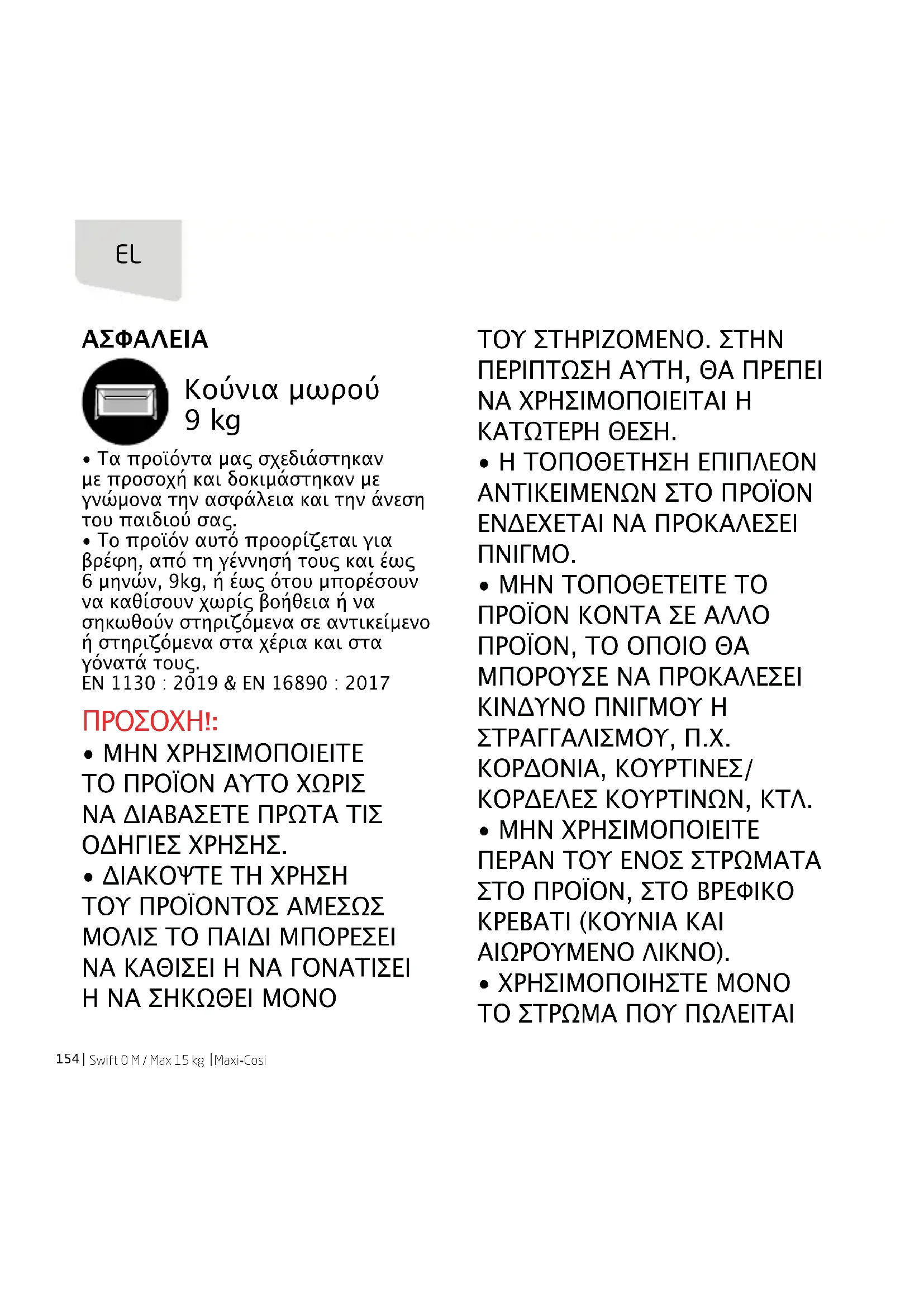 - Το προϊόν αυτό προορίζεται για βρέφη, από τη γέννησή τους και έως 6 μηνών, 9kg, ή έως ότου μπορέσουν να καθίσουν χωρίς βοήθεια ή να σηκωθούν στηριζόμενα σε αντικείμενο ή στηριζόμενα στα χέρια και στα γόνατά τους. EN 1130 : 2019 & EN 16890 : 2017