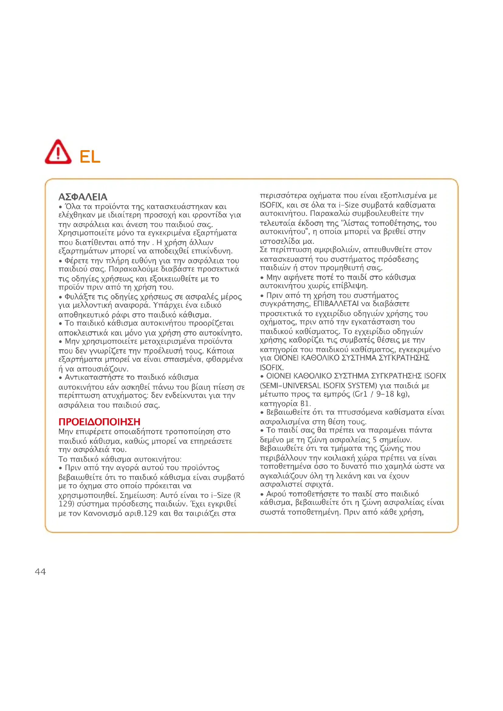 - Σε περίπτωση αμφιβολιών για τη σωστή εγκατάσταση ή χρήση του συστήματος, απευθυνθείτε αμέσως στον κατασκευαστή ή στο κατάστημα λιανικής πώλησης του παιδικού καθίσματος.